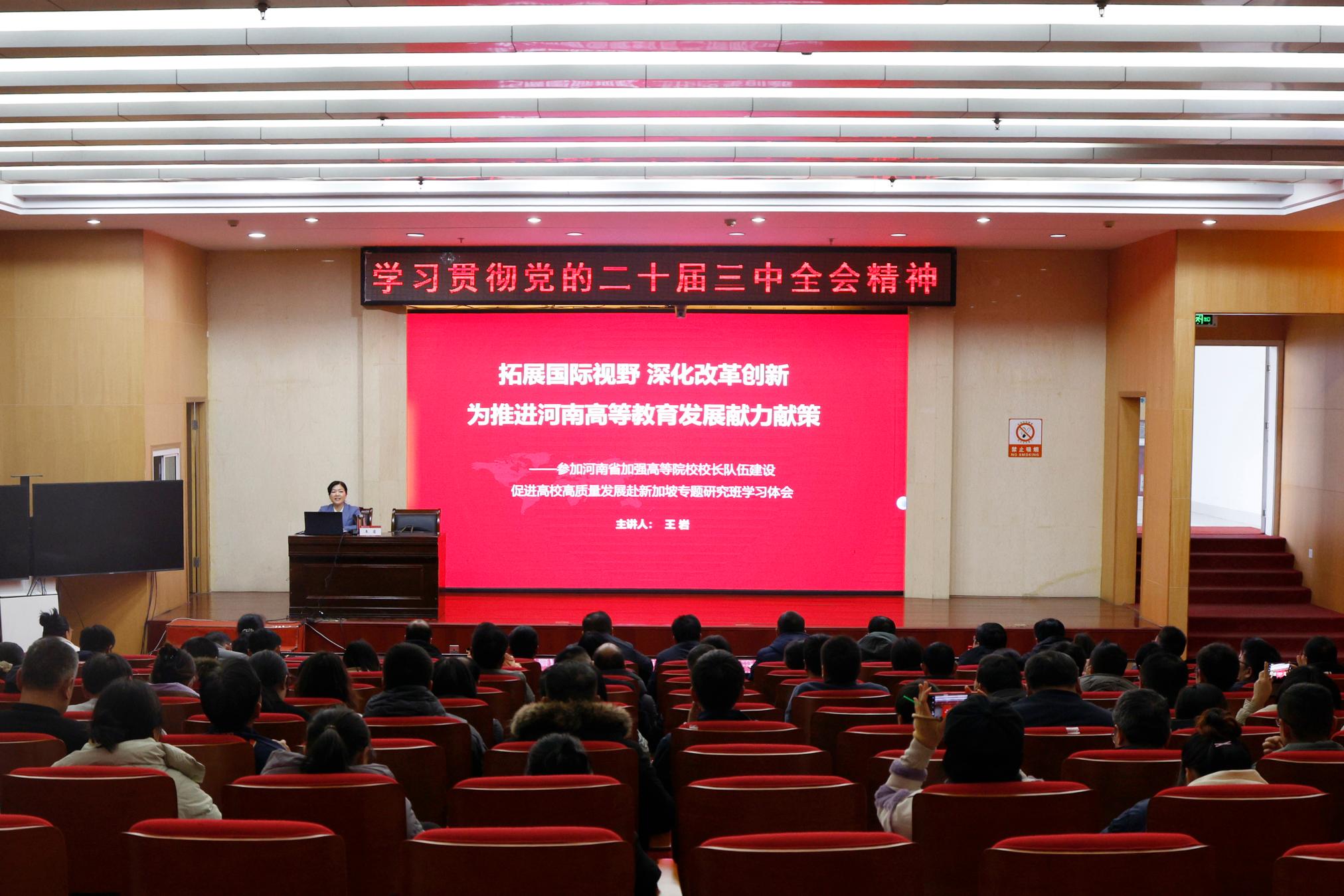 1讲座现场2讲座现场本网讯(王典/文张锡哲/图)1月7日下午,副校长王岩在图书馆报告厅一楼作题为《学习贯彻党的二十届三中全会精神》和《拓展国际视野深化改革创新为推进河南高等教育发展献力献策——参加河南省加强高等院校校长队伍建设促进高校高质量发展赴新加坡专题研究班学习心得体会》的报告。国内合作处、审计处、基建处等10个分管部门和6个联系学院的领导班子、支部书记和师生代表参加此次报告会。会议由国内合作处处长杨洋主持。王岩围绕党的二十届三中全会精神,从全会的重要性、深入学习习近平总书...