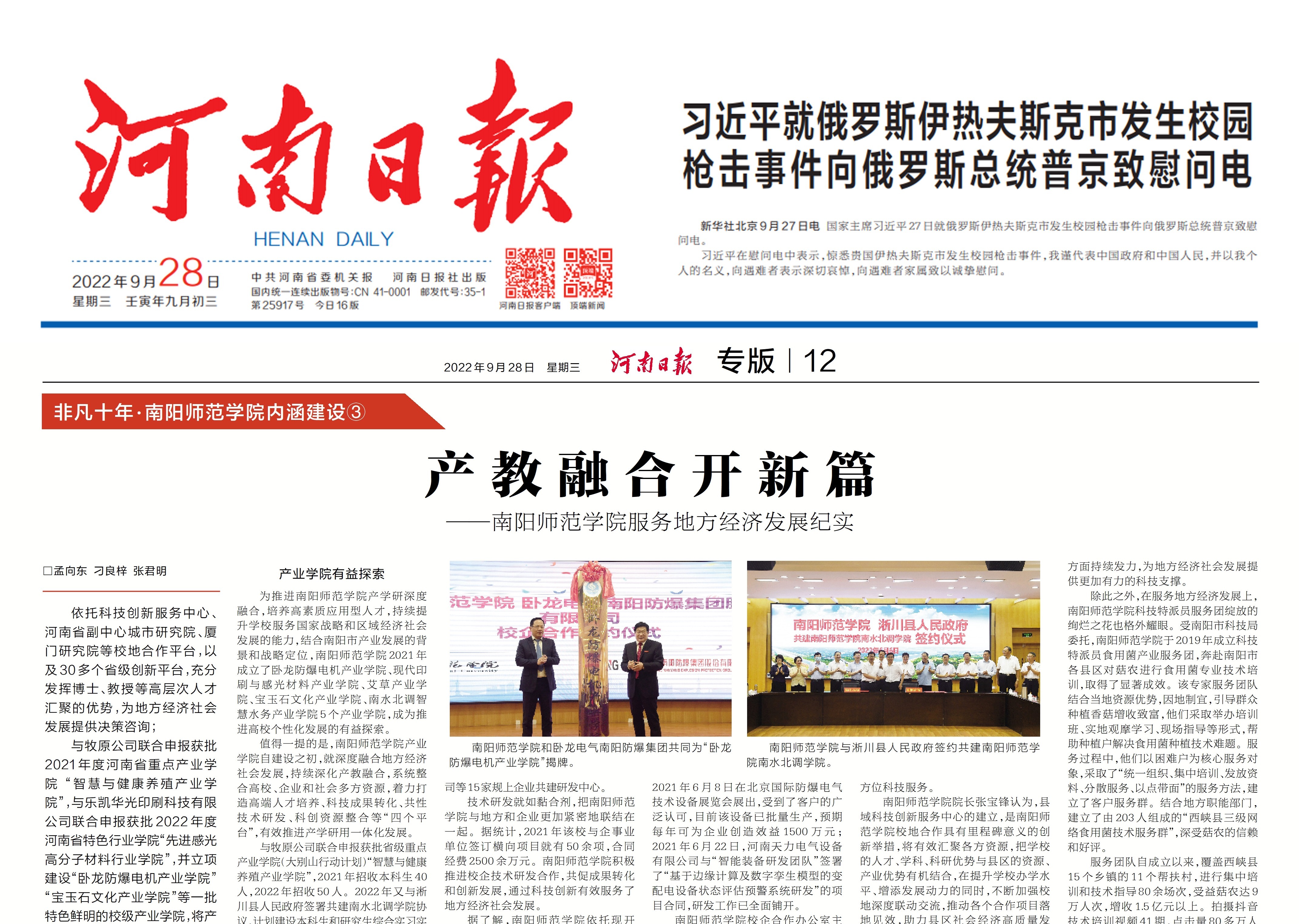 2022年9月28日,《河南日报》“非凡十年·天游ty8线路1线路2检测中心内涵建设”栏目刊发天游ty8线路1线路2检测中心系列文章③《产教融合开新篇——天游ty8线路1线路2检测中心服务地方经济发展纪实》,现全文转载如下:□ 孟向东 刁良梓 张君明依托科技创新服务中心、河南省副中心城市研究院、厦门研究院等校地合作平台,以及30多个省级创新平台,充分发挥博士、教授等高层次人才汇聚的优势,为地方经济社会发展提供决策咨询;与牧原公司联合申报获批2021年度河南省重点产...