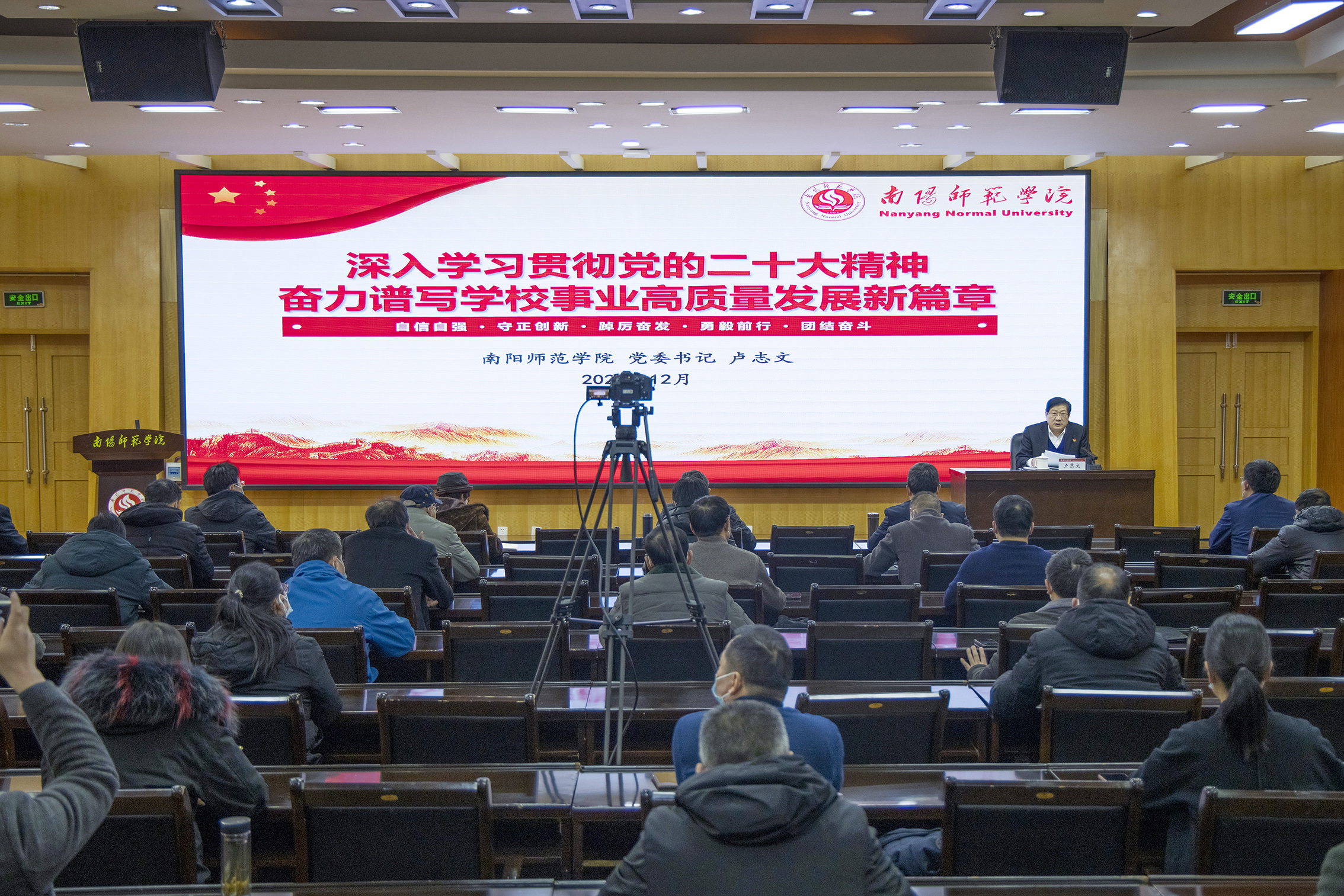 1.会议现场2.校党委书记卢志文作报告3.会议现场本网讯(周耀民/文 王宏洋/图)12月2日下午,天游官网在科技大楼三楼会议室举行学习贯彻党的二十大精神宣讲报告会。校党委书记卢志文作了题为《深入学习贯彻党的二十大精神,奋力谱写学校事业高质量发展新篇章》的报告。各二级党组织书记,马克思主义学院、生命科学与农业工程学院师生代表参加报告会。报告会由党委办公室主任杨宏健主持。卢志文在报告中从深刻认识党的二十大的重大意...
