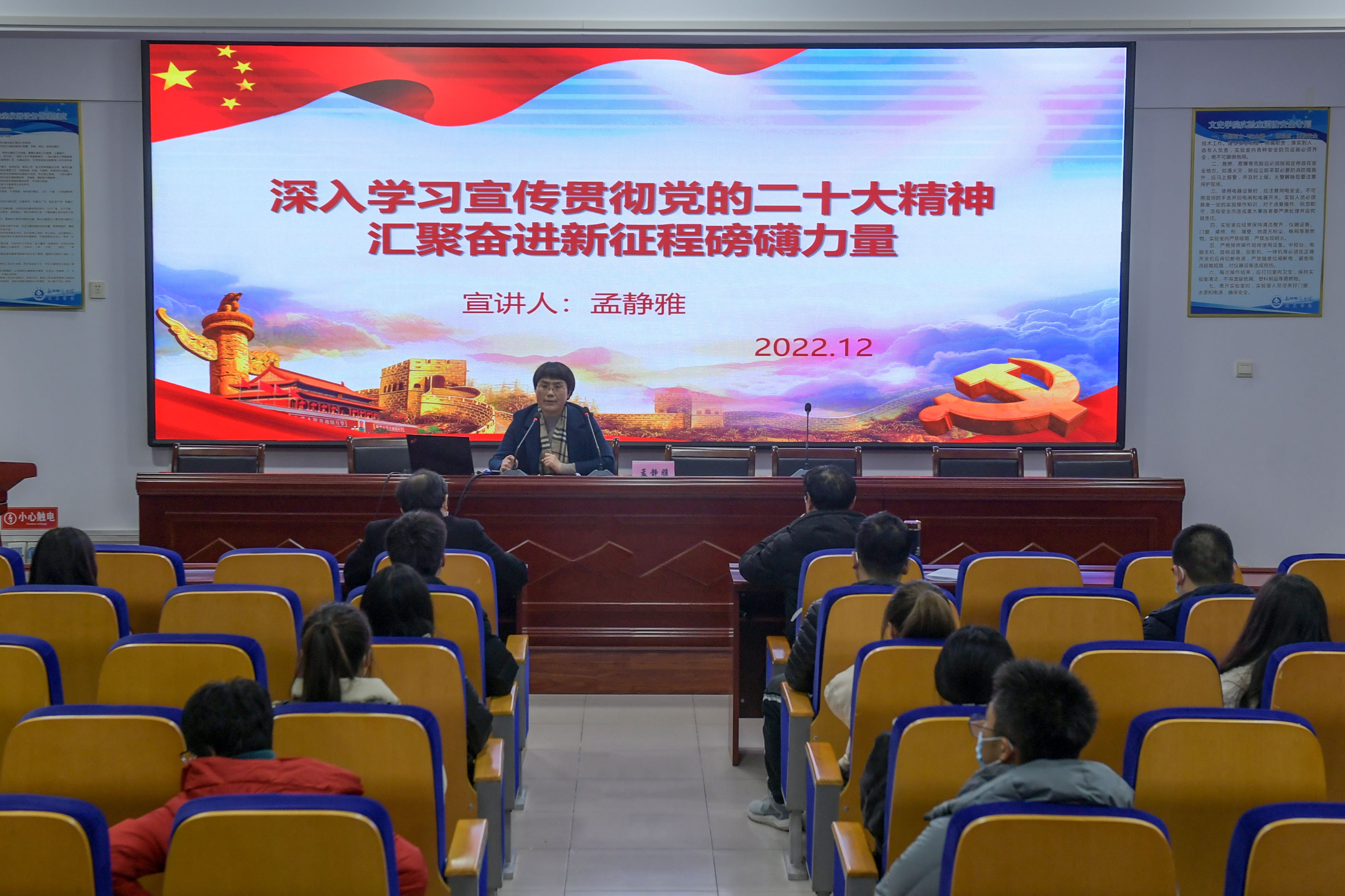 本网讯(滕剑锋/文 王宏洋/图)12月9日晚,副校长孟静雅在逸夫楼南楼305教室作党的二十大精神宣讲专题报告,文学院、数学与统计学院、继续教育学院等单位300余名师生通过线上、线下的方式参加会议。会议由数学与统计学院党委书记张顺安主持。孟静雅以“深入学习宣传贯彻党的二十大精神汇聚奋进新征程磅礴力量”为主题,从党的二十大的主题、主要成果,过去5年和新时代10年的伟大变革,关于马克思主义中国化时代化,关于中国式现...