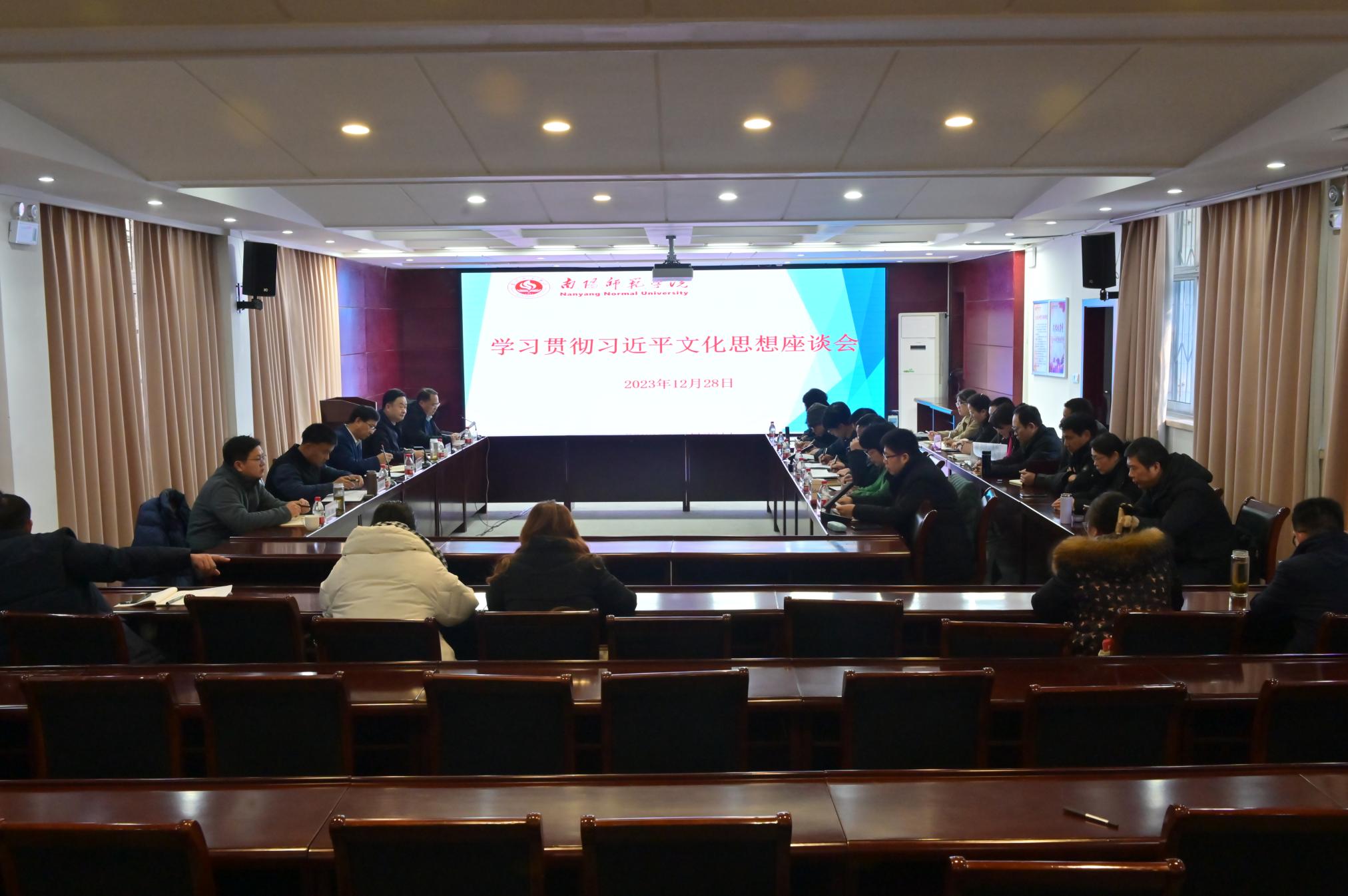12月28日下午,天游官网在办公大楼一楼东会议室召开学习贯彻习近平文化思想座谈会。校长张宝锋,副校长罗永松、刘红林出席会议,相关职能部门代表、学院代表、省兴文化工程文化研究专项项目负责人、相关科研平台负责人参加会议。会议由罗永松主持。社科处处长王春阳,期刊部主任王治国,文学院院长龚世学,历史学院院长高二旺,美术与艺术设...