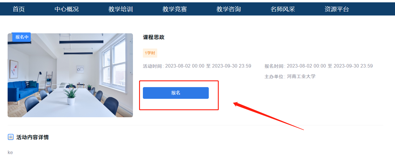 登录天游ty8线路1线路2检测中心教师发展中心网站,点击菜单栏的“综合业务平台”----“培训活动”---“第三十四期教师工作坊”---右上角“登录”,用“手机验证码登录”---“报名”即可。
