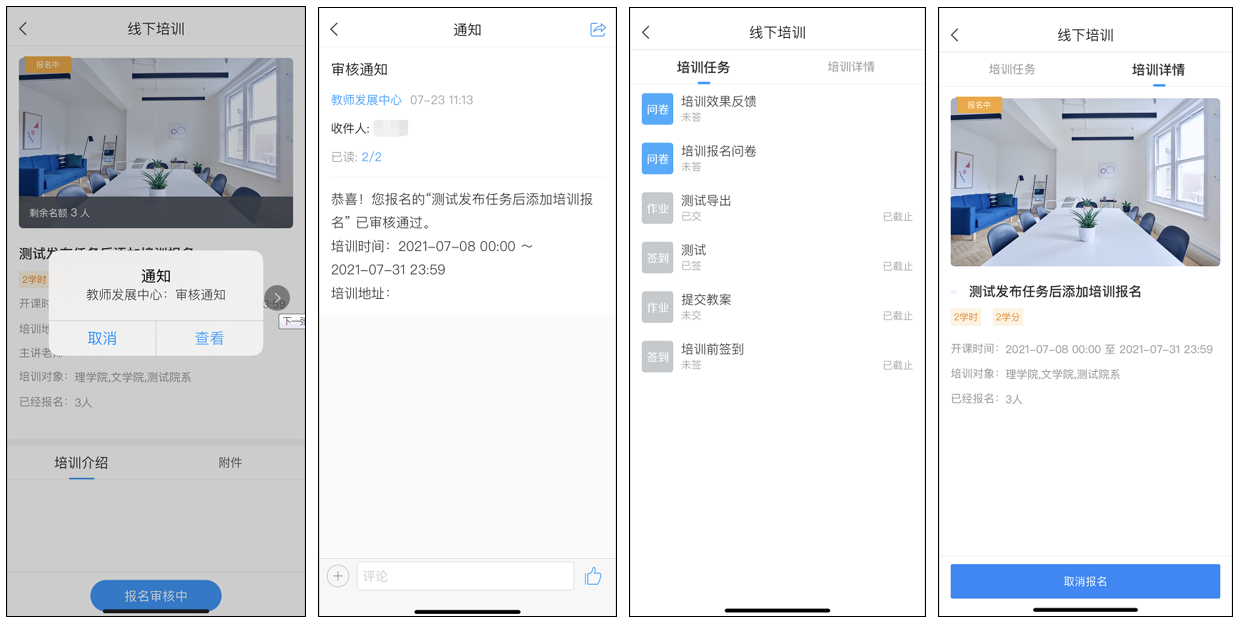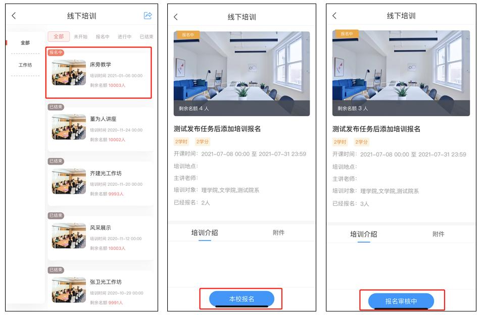 教师登录学习通,右上角输入邀请码“nynujsfz”,进到本校教发中心,点击【线下培训】后选择相应培训点击报名,报名成功后等待管理员审核,审核成功会向教师端发送通知。