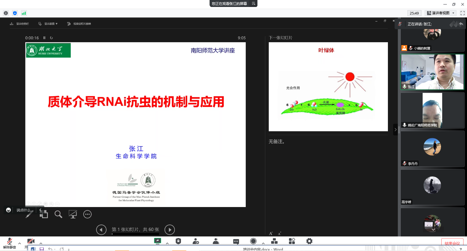 (通讯员 杨树琼文/图)11月25日上午,应生命科学与农业工程学院邀请,湖北大学“楚天学者”特聘教授张江,通过线上形式为天游官网师生做了题为“质体介导RNAi抗虫的机制与应用”的学术报告,报告会由生命科学与农业工程学院院长姚伦广主持。