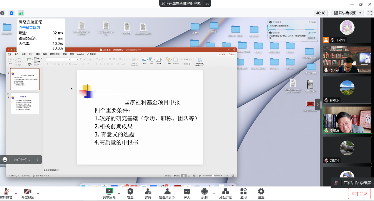 本网讯(通讯员 丁小雨)为做好学院国家社会科学基金项目申报工作,提高项目申报质量,2022年11月25日下午,外国语学院通过腾讯会议召开2023年度国家社科基金项目第二轮论证会。本次论证会邀请到上海外国语大学教授、博士生导师李维屏作为指导老师,主要对学院申报的6项国家社科基金项目的申请书进行论证。外国语学院院长、科研副院长、申报项目的教师及其他相关教师参加本次论证会。