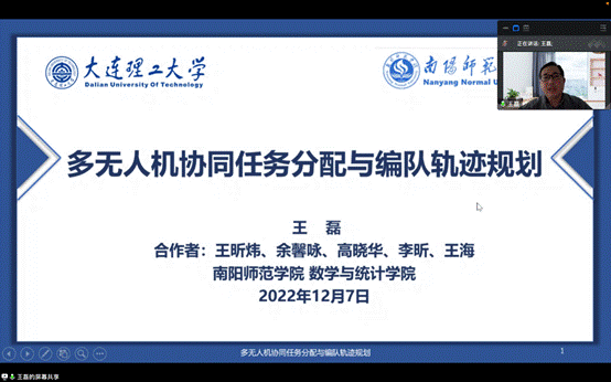 本网讯(通讯员 虎大力、王西贝/图 王西贝/文)12月7日下午,应数学与统计学院邀请,大连理工大学数学科学学院博士生导师王磊教授以线上形式为数学与统计学院师生作了题为《多无人机协同任务分配与编队轨迹规划》的专题报告。报告由数学与统计学院副院长谭冰主持,学院师生共同聆听了报告会。