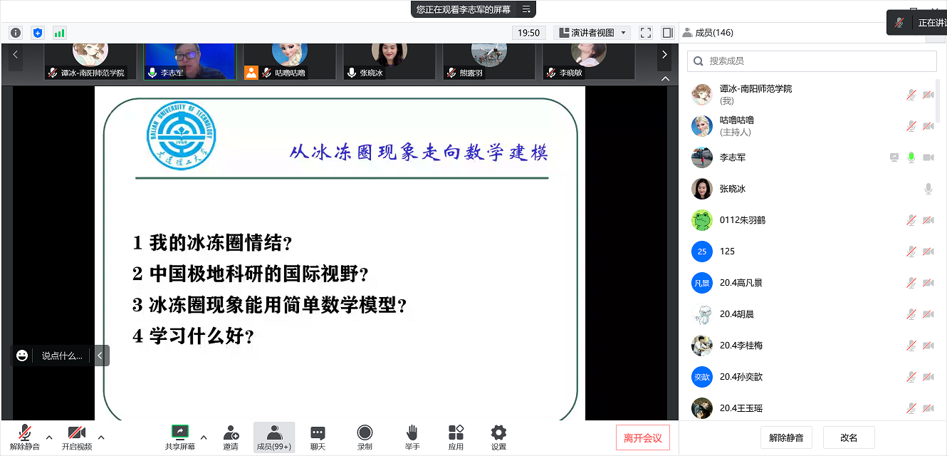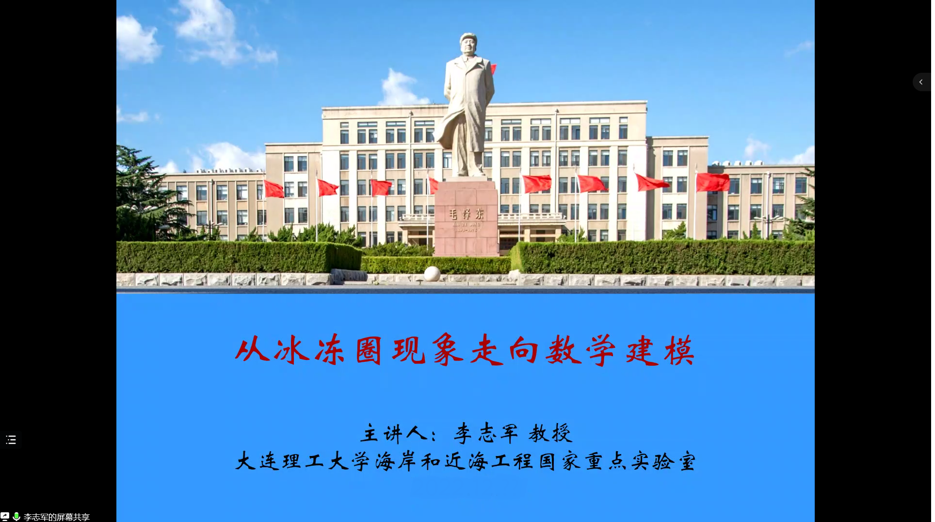 本网讯(通讯员 虎大力 张紫妍/文 张紫妍/图)12月8日晚上,应数学与统计学院邀请,大连理工大学海岸和近海工程国家重点实验室教授、博士生导师李志军以线上形式作了题为《从冰冻圈现象走向数学建模》的专题报告。数学与统计学院师生,芬兰气象研究所程斌研究员,大连理工大学、东北农业大学、长安大学、黑龙江大学等部分师生参加了报告会,会议由数学与统计学院副院长谭冰主持。