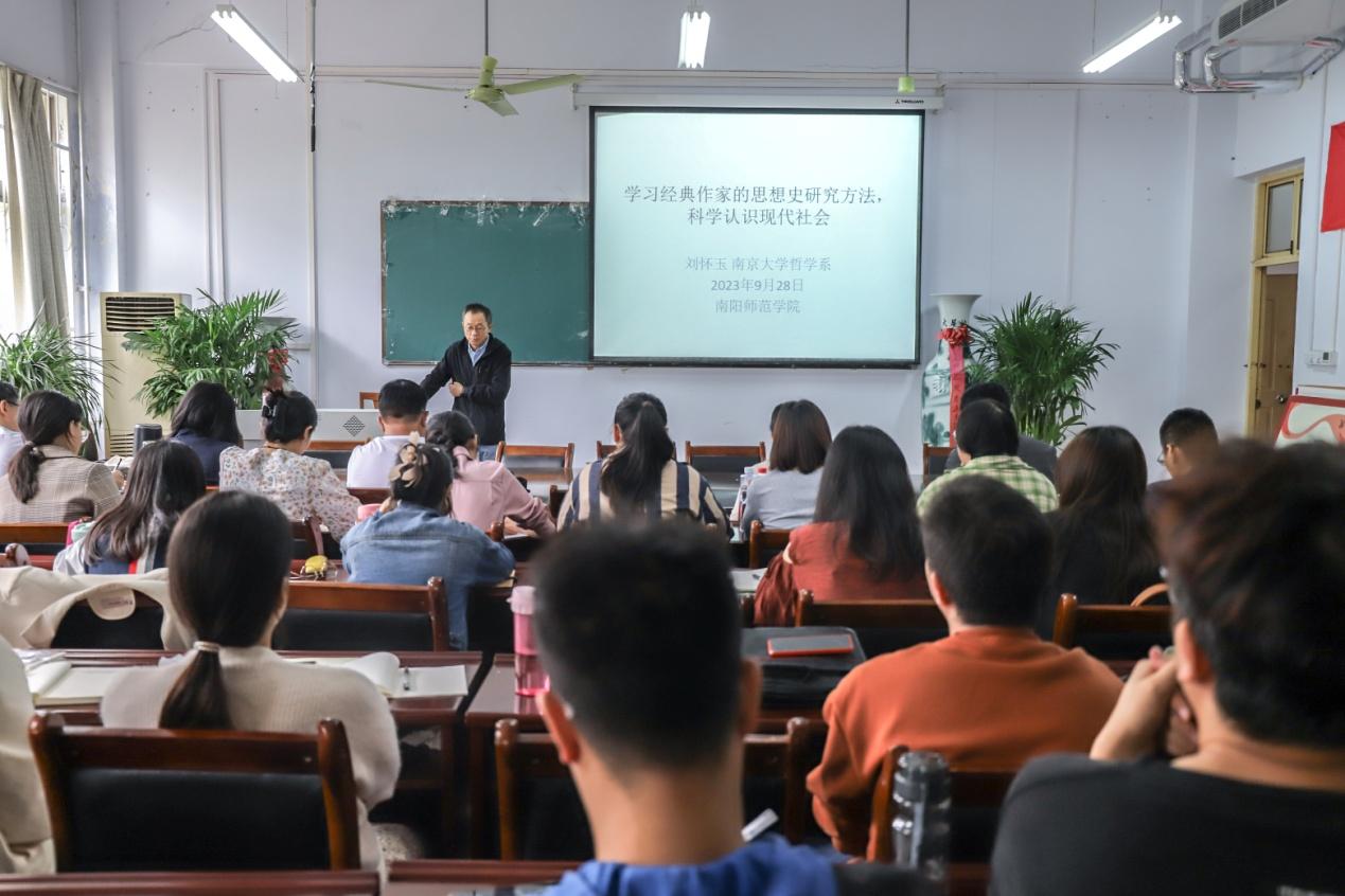 本网讯(牛田盛/文 黄闯/图)9月28日上午,应马克思主义学院邀请,南京大学刘怀玉教授在逸夫楼S105会议室为马院研究生和研究生导师作题为《学习经典作家的思想史研究方法科学认识现代社会》的学术讲座。会议由马克思主义学院院长靳安广主持,全体研究生及研究生导师与会。
