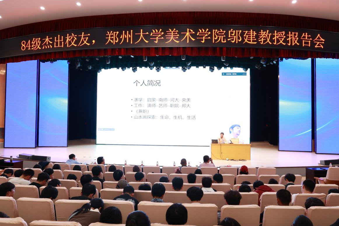 本网讯(张艺菲/文 赵中嘉/图)10月14日下午,天游官网84级杰出校友、郑州大学美术学院邬建教授应美术与艺术设计学院邀请,在天游官网中区演播厅作题为“水墨有意、丹青有情——画家的艺术之路”的专题报告。报告会由美术与艺术设计学院党委书记耿耀敬主持,学院2023级新生及部分教师共500多人参加。报告会同步线上直播,部分校友在线上参与。