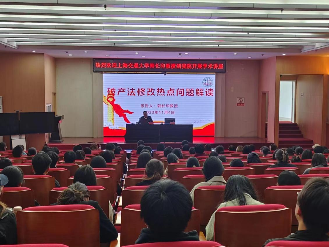 本网讯(王泽琦/文 马淑杰/图)11月4日下午,应法学院邀请,上海交通大学韩长印教授在西区图书馆一楼报告厅作题为《破产法修改热点问题解读》的专题报告。报告会由法学院院长赵溢鑫主持,法学院200余名师生参加报告会。