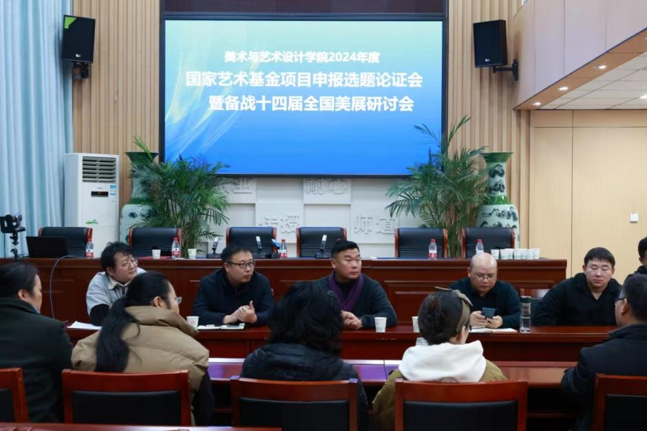 本网讯(通讯员 黄万埔)11月17日下午,美术与艺术设计院2024年度国家艺术基金项目申报论证会暨备战十四届全国美展研讨会在艺术楼三楼会议室召开。会议特邀获立两项国家艺术基金项目、两次入选全国美术届展的知名漆画艺术家、商丘师范学院程安营老师主讲,该院相关申报国家艺术基金项目的老师参加本次论证会。会议由美术与艺术设计学院副院长陈晅嵘主持。