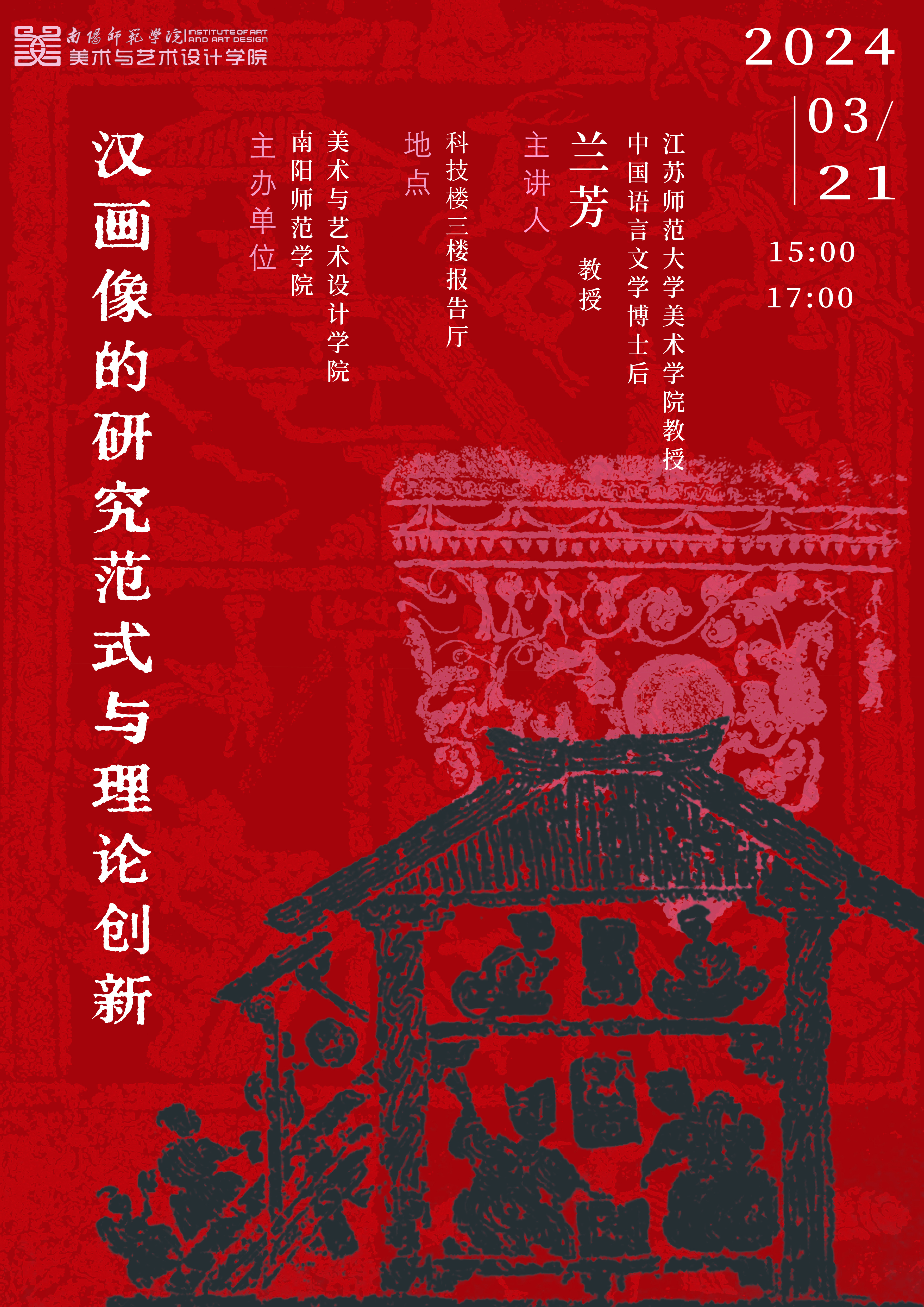 报告人简介:兰芳,教授,设计学博士,中国语言文学博士后。江苏师范大学美术学院副院长,硕士生导师。江苏省“333高层次人才”。传统文化传承与创新研究中心负责人。美国北卡莱罗纳教堂山分校(UNC)访问学者,中国文艺理论学会会员,中国汉画学会会员,江苏省美学学会会员。连续两次获国家社科基金艺术学项目;主持、完成省部级项目10余项;出版专著2部,发表学术论文30余篇。多次策划、主持文创作品展与智库论坛,2021年指导“温故·知新——‘汉画像的日常’设计工作坊”获教育部全国大学生艺术展演活动一等奖;2023年指导“汉画数字智库”项目获第十三届“挑战杯”中国大学生创业计划竞赛铜奖;2020年文创产品参加华东师范大学举办的“石上风华—新见汉代画像石拓片展”;2019年在华东师范大学举办汉画像审美意象的传播智库论坛暨汉画像文创产品设计展。