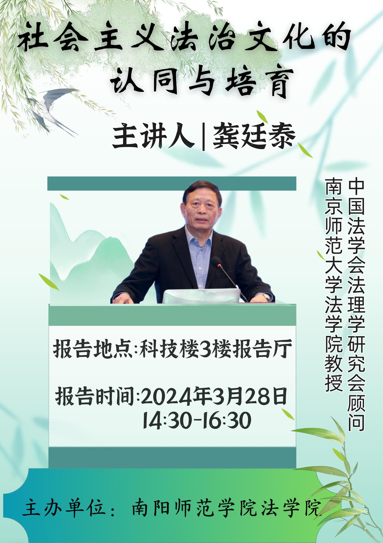 报告人简介:龚廷泰,男,南京师范大学法学院二级教授、博士生导师。现任南京师范大学江苏法治发展研究院院长、中国法治现代化研究院副院长,兼任中国法学会法理学研究会顾问。研究领域法学理论、马克思主义法律思想史、西方法哲学。主持国家社科基金项目3项,主编与合著《社会主义法治文化研究》《马克思主义法律思想通史》(4卷本)《列宁法律思想研究》《新时代的中国式社会治理法治化》等著作20余部,在《中国法学》《法学》《法学家》等学术期刊上发表学术论文120余篇,先后获得国务院政府特殊津贴、国家级教学成果奖二等奖1次,与公丕祥教授共同总主编的《马克思主义法律思想通史》(4卷本)分别获第四届中国出版政府奖图书奖和第八届教育部人文社会科学优秀成果一等奖。