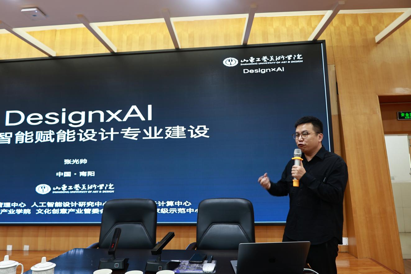 本网讯(文/侯晓涵 图/赵中嘉)2024年4月19日下午,应美术与艺术设计学院邀请,知名人工智能设计领域专家、山东工艺美术学院数字艺术与传媒学院副院长张光帅教授在科技楼三楼会议室作题为《Design×AI 人工智能赋能设计教育改革》的学术报告。报告会由美术与艺术设计学院副院长陈晅嵘主持,学院师生代表共计200多人参加。