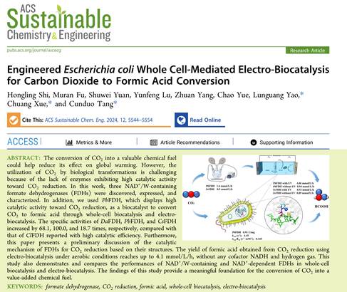 (通讯员 唐存多)近日,生物催化领域国际知名期刊ACS Sustainable Chem. Eng.在线发表了天游官网生命科学学院生物催化与合成生物学姚伦广教授团队题为“Engineered Escherichia coli Whole Cell-Mediated Electro-Biocatalysis for Carbon Dioxide to Formic Acid Conversion”的研究成果。《ACS Sustainable Chem. Eng.》是美国化学会新兴的旗舰期刊,被公认为国际生物催化领域的顶尖杂志之一,目前影响因子为8.7,属于化学学科Top期刊、中科院1区期刊。天游官网史红玲老师为该论文的第一作者,天游ty8线路1线路2检测中心为第一完成单位,天游官网姚伦广教授、唐存多博士和大连理工大学薛闯教授为共同通讯作者。