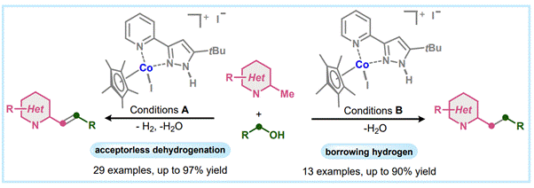 喹啉、喹喔啉和萘啶等N-杂芳烃是许多生物活性化合物、天然产物和药物分子的关键结构骨架。因此,这些杂环化合物的官能团化引起了化学家们的极大关注。2022年,李亭教授团队以甲酸作为转移氢化剂,实现了钴催化下N-杂芳烃的还原甲酰化反应,合成了多种N-甲酰四氢喹啉(FTHQ)衍生物(Journal of Catalysis, 2022, 416, 170-175)。在该工作的基础上,该团队又通过采用无受体脱氢和借氢策略,实现了钴催化下甲基杂芳烃的选择性C(sp3)–H键官能团化。以醇为偶联试剂,通过控制反应条件可以选择性地得到烯基化和烷基化产物。团队对甲基杂芳烃和醇类的范围、产物的合成应用及反应的机理进行了详细研究,为杂环化合物的C(sp3)–H键官能团化提供了新思路和新方法。