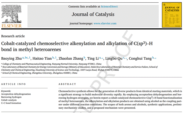 近日,化学与制药工程学院光电绿色催化与药物合成研究团队在《Journal of Catalysis》上发表题为“Cobalt-catalyzed chemoselective alkenylation and alkylation of C(sp3)–H bond in methyl heteroarenes”的研究论文。该期刊为中科院SCI大类一区,最新影响因子为7.3。化学与制药工程学院硕士研究生朱保颖为论文第一作者,李亭教授为通讯作者,天游ty8线路1线路2检测中心为该论文第一署名单位。