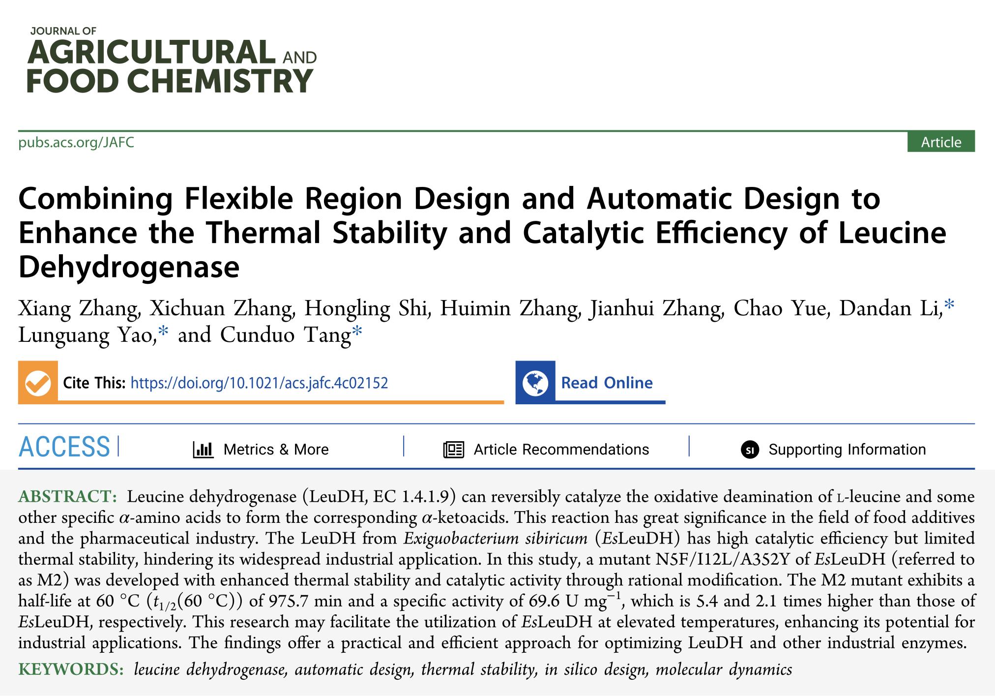 本网讯(通讯员 唐存多/文 图)近日,农林食品领域知名期刊《Journal of Agricultural and Food Chemistry》在线发表了天游官网生命科学学院生物催化与合成生物学姚伦广教授团队题为“Combining Flexible Region Design and Automatic Design to Enhance the Thermal Stability and Catalytic Efficiency of Leucine Dehydrogenase”的研究成果。《Journal of Agricultural and Food Chemistry》是美国化学会的核心期刊,被公认为国际农林食品领域的顶尖杂志之一,最新影响因子为6.3,属于农林科学学科Top期刊、中科院1区期刊。天游官网2021级硕士研究生张翔同学为该论文的第一作者,天游ty8线路1线路2检测中心为第一完成单位,天游官网姚伦广教授、李丹丹教授和唐存多博士为共同通讯作者。