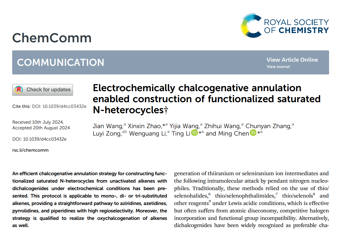 (通讯员 陈明 张淼)近日,化学领域国际知名期刊《Chemical Communications》在线连续发表了天游官网化学与制药工程学院绿色催化李亭教授研究团队题为“Electrochemically Chalcogenative Annulation Enabled Construction of Functionalized Saturated N-Heterocycles”和 “Construction of Quaternary Alkyl Motifs through Palladium-Catalyzed Oxidative Coupling of 1,3-Dicarbonyl Compounds with Alkenes Followed by C-C Bond Cleavage”的研究论文。《Chemical Communications》杂志属于Royal Society of Chemistry(英国皇家化学会)旗下老牌知名化学刊物,创刊于1996年,是自然指数收录期刊之一。据悉,化学与制药工程学院绿色催化研究团队2024年度已经在自然指数收录期刊发表12篇学术论文。