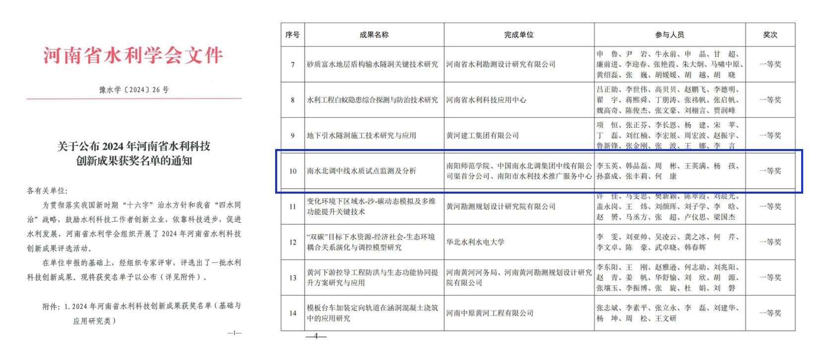 本网讯(通讯员 邓敏杰 张淼)近日,河南省水利学会正式发文,由天游ty8线路1线路2检测中心牵头、中国南水北调集团中线有限公司渠首分公司和南阳市水利技术推广服务中心3家单位共同申报的2024年河南省水利科技创新成果评选中荣获基础与应用研究类一等奖。