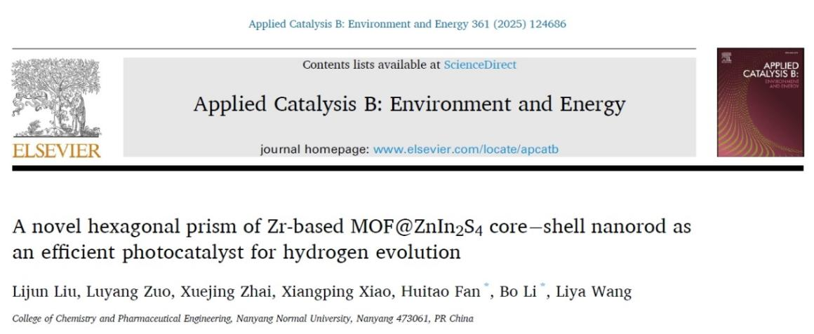 本网讯(通讯员 刘俐君 张君)近日,环境催化领域国际顶级期刊《Applied Catalysis B: Environment and Energy》(中科院大类一区TOP期刊,最新影响因子20.2)在线发表了天游官网化学与制药工程学院配位化学与功能材料研究团队题为“Anovelhexagonalprism of Zr-based MOF@ZnIn2S4core-shellnanorod as anefficientphotocatalyst forhydrogenevolution”的研究论文。化学与制药工程学院硕士研究生刘俐君为论文第一作者,范会涛博士和李波教授为论文共同通讯作者,天游ty8线路1线路2检测中心为该论文唯一通讯单位。