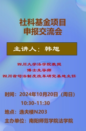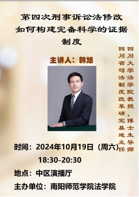 报告人简介:韩旭,法学博士、博士后,四川大学法学院教授、博士生导师,四川省司法制度改革研究基地主任,享受国务院特殊津贴专家、首届四川省十大优秀中青年法学家、四川省十大法治人物、四川省有突出贡献的优秀专家,兼任中国刑事诉讼法学研究会常务理事兼学术委员会委员、中国犯罪学研究会常务理事等学术职务;被聘为中共四川省委、四川省人民政府法律顾问、遂宁市人民政府法律顾问,担任四川省法官检察官遴选委员会委员、中共四川省委宣讲团成员、四川省人民政府学科评议专家等社会职务。出版《检察官客观义务论》、《被追诉人取证权研究》、《司法改革与中国刑事证据制度的完善》、《认罪认罚从宽制度研究》等学术著作12部(独著7部、合著5部),在《法学研究》、《法学家》、《清华法学》、《法商研究》、《法学》、《现代法学》、《当代法学》等学术期刊发表论文100余篇,被人大报刊复印资料《诉讼法学 司法制度》、《刑事法学》全文转载8篇;主持国家社科基金课题、教育部人文社科基地重大项目、中国法学会部级研究课题、最高人民检察院检察理论研究课题、四川省哲学社会科学规划课题等省部级及其以上课题6项,参与国家重大课题、重点课题5项;获得“第三届中国法学优秀成果奖”、“中国犯罪学十年优秀科研奖”、第十五次、十六次、十八次四川省哲学社会科学优秀成果奖等省部级以上政府奖励7项。先后应邀到英国、美国、丹麦、瑞典、韩国等国家人权研究机构和芝加哥大学、首尔大学、伦敦威斯敏斯特治安法院、丹麦人权研究所、瑞典瓦伦堡人权研究所等进行学术访问。受邀为中国政法大学、中国人民大学、浙江大学、南京大学等大学法学院举办学术讲座。多次为四川省人民政府常务会议、省委政法委“书记办公会”会前学法进行专题讲座;常为国家机关单位、企事业单位、国内各大高等学校进行专题授课。