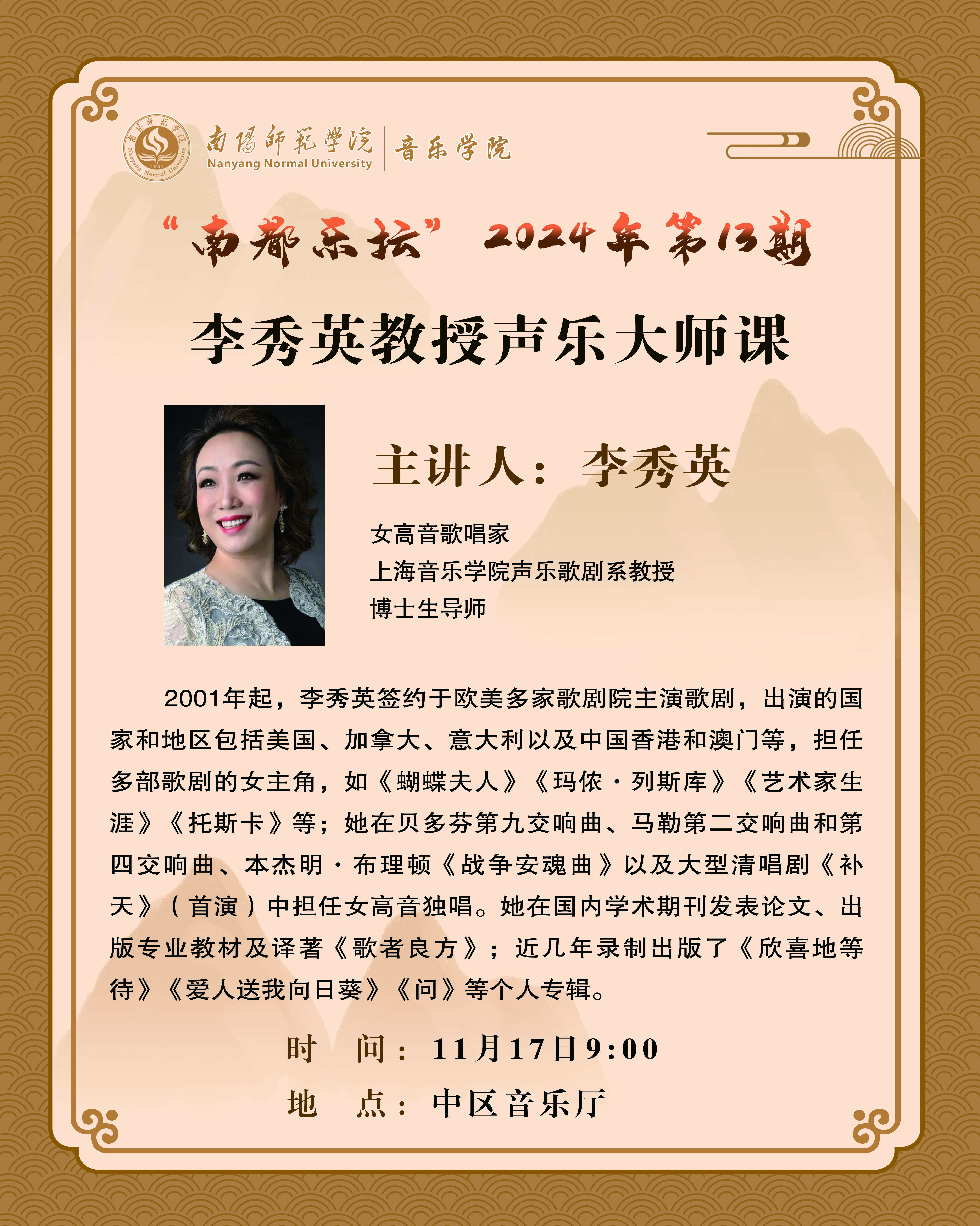 报告人简介:李秀英,上海音乐学院声乐歌剧系教授,女高音歌唱家,博士生导师。2001年起,李秀英签约与欧美多家歌剧院主演歌剧,出演的国家和地区包括美国,加拿大,意大利以及中国香港和澳门等,担任多部歌剧的女主角,如《蝴蝶夫人》《码侬·列斯库》《艺术家生涯》《托斯卡》等;她在贝多芬第九交响曲,马勒第二交响曲和第四交响曲,本杰明·布理顿《战场安魂曲》以及大型清唱剧《补天》(首演)中担任女高音独唱。她在国内学术期刊发表论文,出版专业教材及译著《歌者良方》;近几年录制出版了《欣喜地等待》《爱人送我向日葵》《问》等个人专辑。
