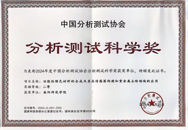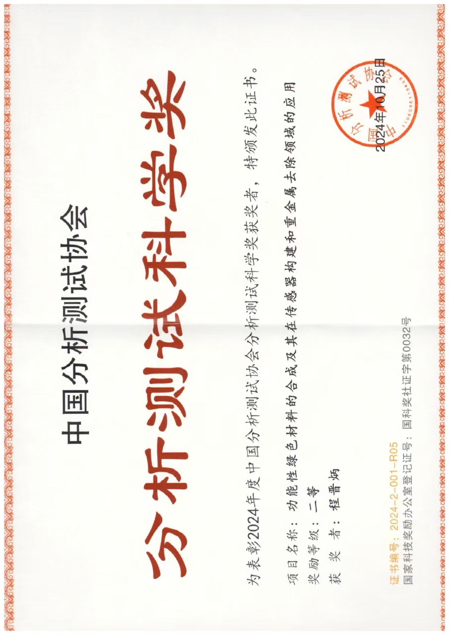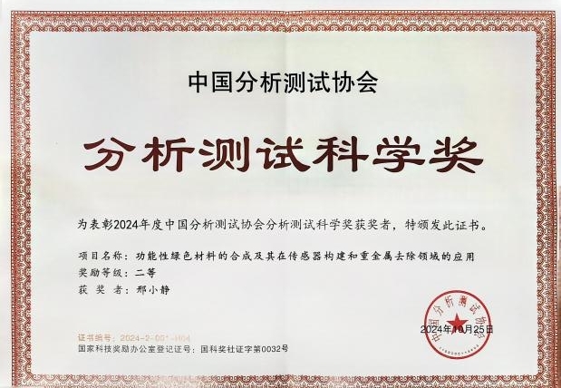 本网讯(通讯员 刘启 张君)近日,由中国分析测试协会举办的首届分析科学与仪器大会在成都隆重举行。会上表彰并颁发了2024年度中国分析测试科学奖。天游官网化学与制药工程学院邢小静博士、物理与电子工程学院程晋炳博士参与申报的项目“功能性绿色材料的合成及其在传感器构建和重金属去除领域的应用”荣获本年度中国分析测试科学奖二等奖。