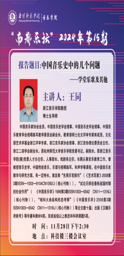 报告人简介:王同,浙江音乐学院教授,博士生导师。中国音乐家协会会员、中国音乐史学会理事、中国音乐史学会理事、中国音乐教育学会视唱练耳教学委员会副会长,教育部硕士论文评审专家库成员,文化部艺术学基金浙江评审专家,浙江音乐家协会理事、浙江音协理论委员会主任、浙江二胡学会副会长。原杭州师范大学音乐学院党委书记、副院长,原浙江音乐学院(筹)党委人才办主任、人事部长、戏剧系主任。长期从事音乐教育工作,曾教授音乐史学、中国传统音乐、乐理与视唱练耳、和声学等课程,曾发表核心论文数十篇;出版《汉魏乐府新考》等专著和教材4部。完成省级以上教改和科研课题5项。