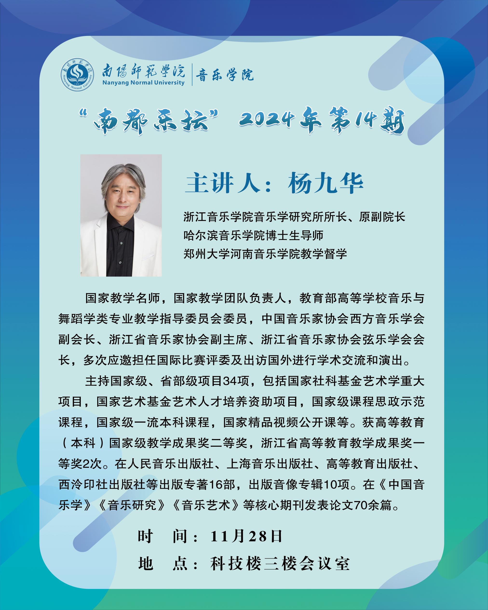 报告人简介:杨九华,白族,浙江音乐学院音乐学研究所所长、原副院长,哈尔滨音乐学院博士生导师,郑州大学河南音乐学院教学督学。国家教学名师,国家教学团队负责人,教育部高等学校音乐与舞蹈学类专业教学指导委员会委员,中国音乐家协会西方音乐学会副会长、浙江省音乐家协会副主席、浙江省音乐家协会弦乐学会会长,主持国家级、省部级项目34项,获高等教育(本科)国家级教学成果奖二等奖,浙江省高等教育教学成果奖一等奖2次。出版专著16部,出版音像专辑10项,发表核心期刊发表论文70余篇。