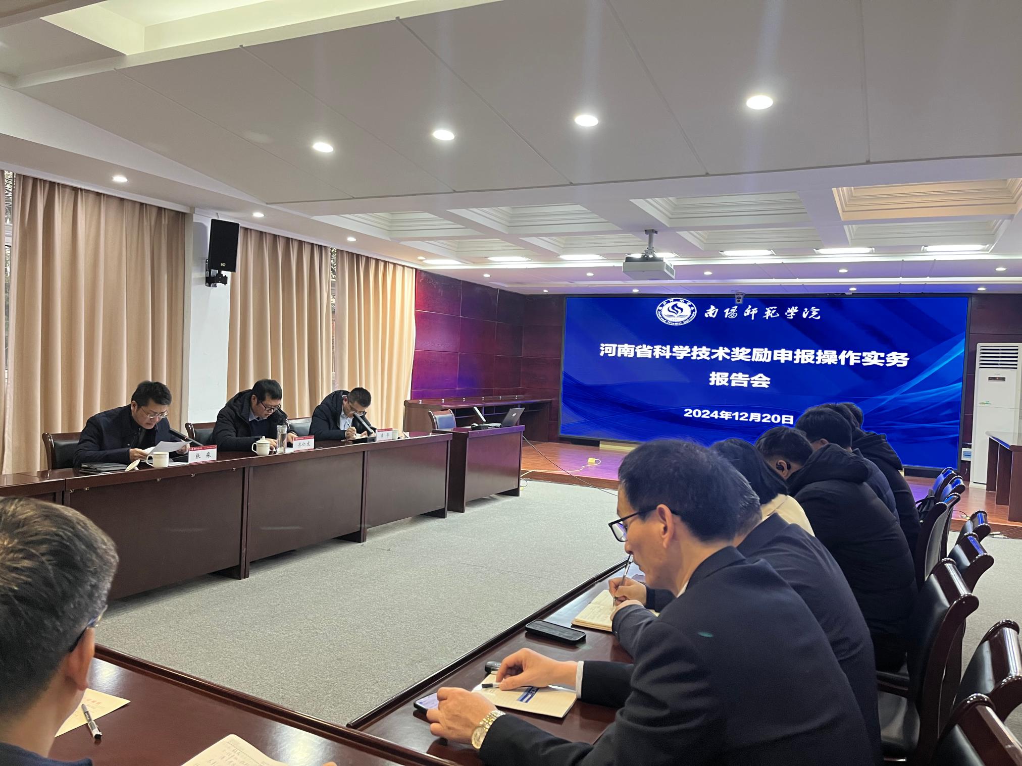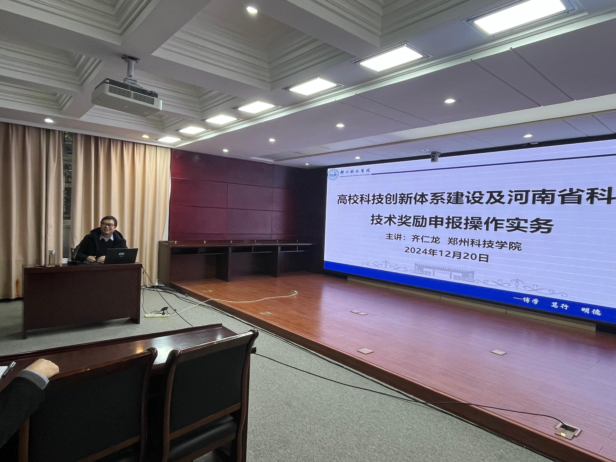本网讯(通讯员 张君 张淼)12月20日下午,应天游官网科技处之邀,郑州科技学院齐仁龙教授莅临天游官网,于办公楼东一楼会议室作题为《高校科技创新体系建设及河南省科学技术奖励申报操作实务》的专题学术报告。此次报告旨在为天游官网理工科单位相关领导及拟申报2025年度河南省科学技术奖的教师提供全面、深入的指导。报告会由科技处副处长张淼主持,科技处全体成员、各二级单位负责人、科研团队负责人及其他有意向申报国家、省部级科学技术奖的人员参加。