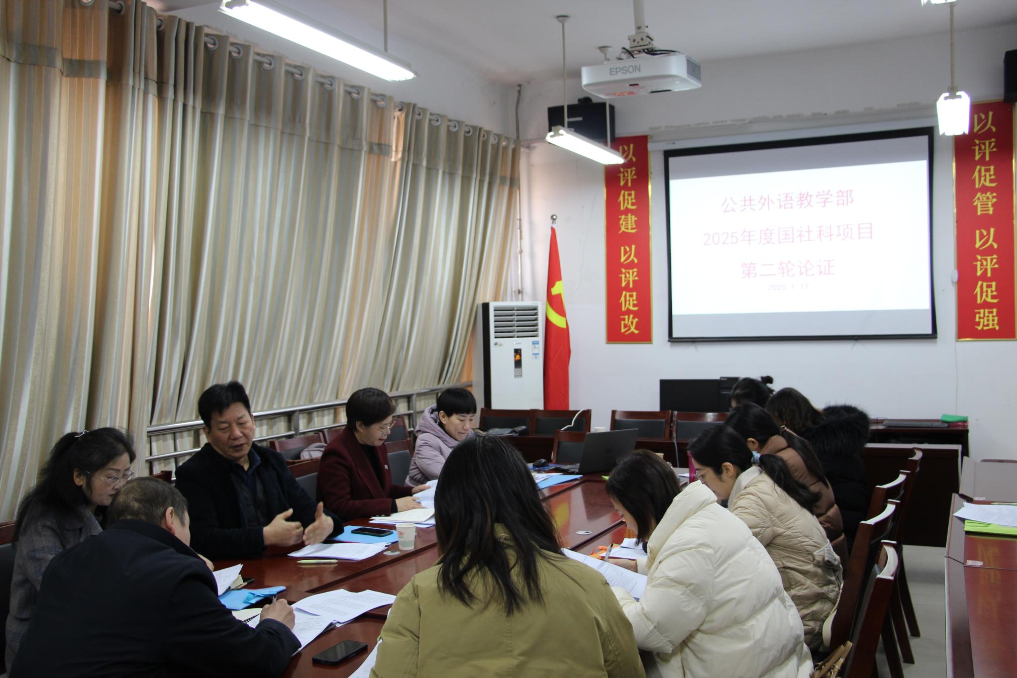 本网讯(通讯员 关建平)1月17日,公共外语教学部在科技楼401会议室举行2025年度国家社科基金项目申报第二轮论证会。会议由公共外语教学部主任宗云主持,邀请社科处副处长张艳教授、文学院马晓玲博士和袁善来博士指导论证,公共外语教学部相关教师参加。