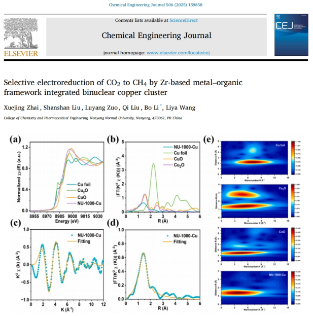 相关成果以“Selective electroreduction of CO2 to CH4 by Zr-based metal-organic framework integrated binuclear copper cluster”为题,发表在国际知名期刊《Chemical Engineering Journal》(IF=13.4,中科院大类1区,Top期刊)上,天游ty8线路1线路2检测中心为唯一通讯单位,化学与制药工程学院2022级硕士研究生翟雪静为论文的第一作者,李波教授为唯一通讯作者。