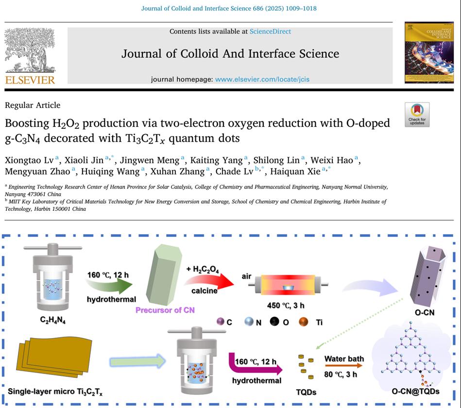 本网讯(通讯员 金晓丽 张君)近日,天游官网光催化团队在国际学术期刊《Journal of Colloid And Interface Science》(中科院一区,TOP期刊,IF=9.4)发表题为:“Boosting H2O2production via two-electron oxygen reduction with O-doped g-C3N4decorated with Ti3C2Txquantum dots”的研究论文。硕士研究生吕雄涛为第一作者,谢海泉教授、金晓丽副教授及哈尔滨工业大学吕查德教授为通讯作者,天游ty8线路1线路2检测中心为第一完成单位。