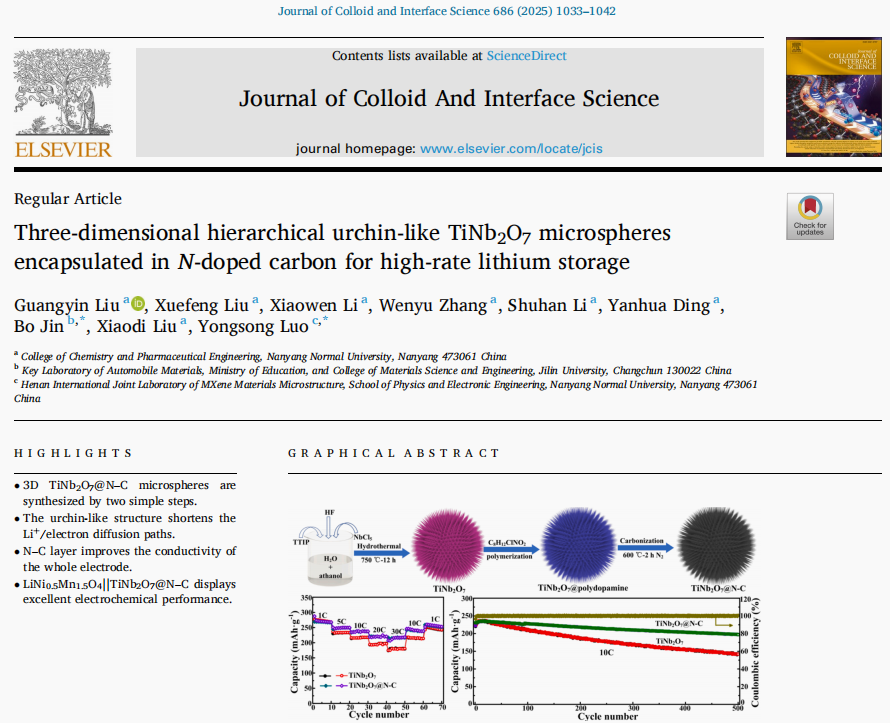 本网讯(通讯员 刘启 张君)近日,天游官网化学与制药工程学院纳米储能材料研究团队与物理与电子工程学院新能源材料与器件团队合作在国际知名化学类期刊《Journal of Colloid And Interface Science》(中科院大类1区,TOP期刊,影响因子9.4)上发表题为“ Three-dimensional hierarchical urchin-like TiNb2O7microspheres encapsulated inN-doped carbon for high-rate lithium storage ”的研究论文。刘光印博士为论文第一作者,罗永松教授和吉林大学金波教授为通讯作者,天游ty8线路1线路2检测中心为该论文的第一署名单位。
