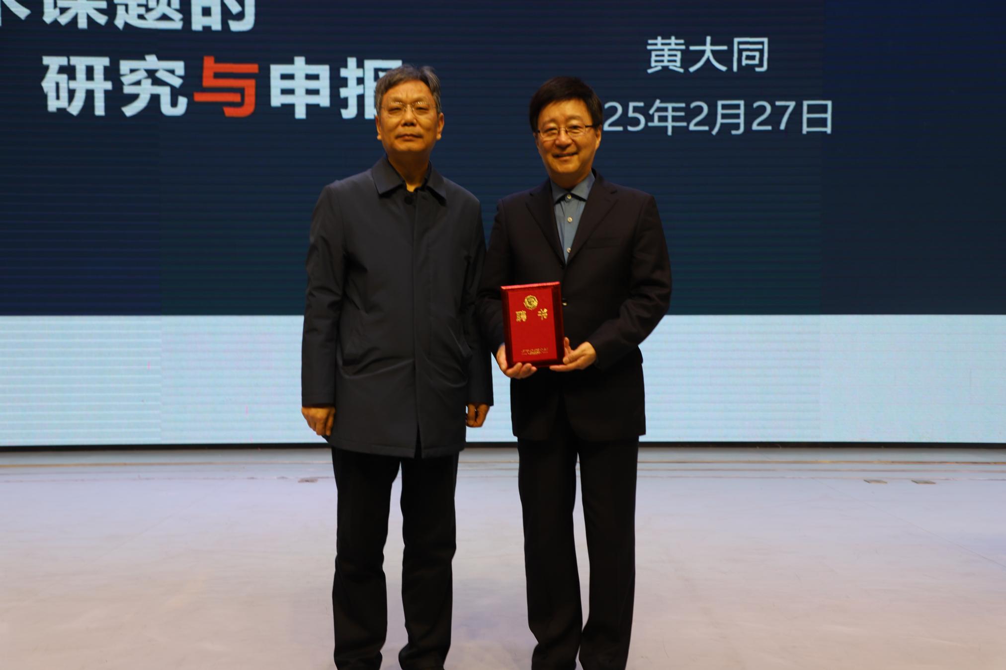 本网讯(通讯员 马玉香/文 丁新如/图)2月27日上午,应音乐学院邀请,温州大学博士生导师黄大同教授在天游ty8线路1线路2检测中心中区学术报告厅为天游官网师生作题为“艺术课题的研究与申报”的学术报告。报告会前,校纪委书记、监察专员刘守勇为黄大同教授颁发了天游官网兼职教授聘书。音乐学院院长季伟、副院长张文敏等院系领导,以及各专业教师、学生代表200余人参加了报告会。