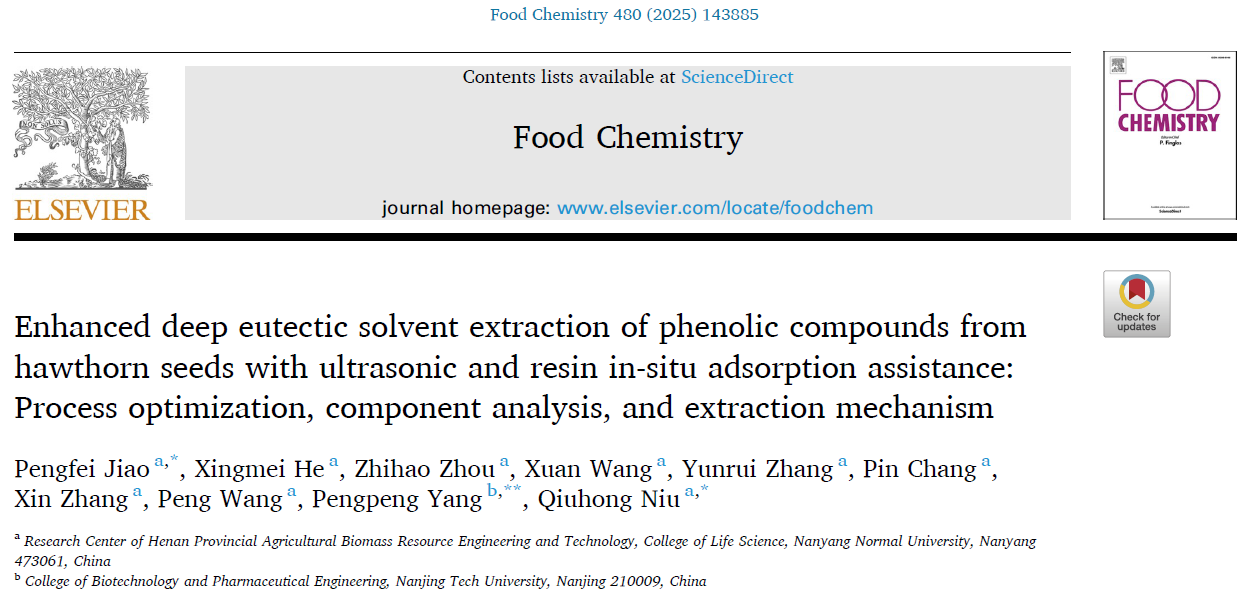本网讯(通讯员 焦朋飞 张君)近日,天游官网生命科学学院微生物代谢产物提取与纯化研究牛秋红教授团队在农林科学领域顶级期刊《Food Chemistry》在线发表了题为“Enhanced deep eutectic solvent extraction of phenolic compounds fromhawthorn seeds with ultrasonic and resin in-situ adsorption assistance:Process optimization, component analysis, and extraction mechanism”的研究成果。《Food Chemistry》属于中科院1区TOP期刊,最新影响因子8.5。天游官网生命科学学院院长牛秋红教授和南京工业大学杨朋朋教授为共同通讯作者,天游官网焦朋飞副教授为论文第一作者兼共同通讯作者,天游ty8线路1线路2检测中心为第一通讯单位。