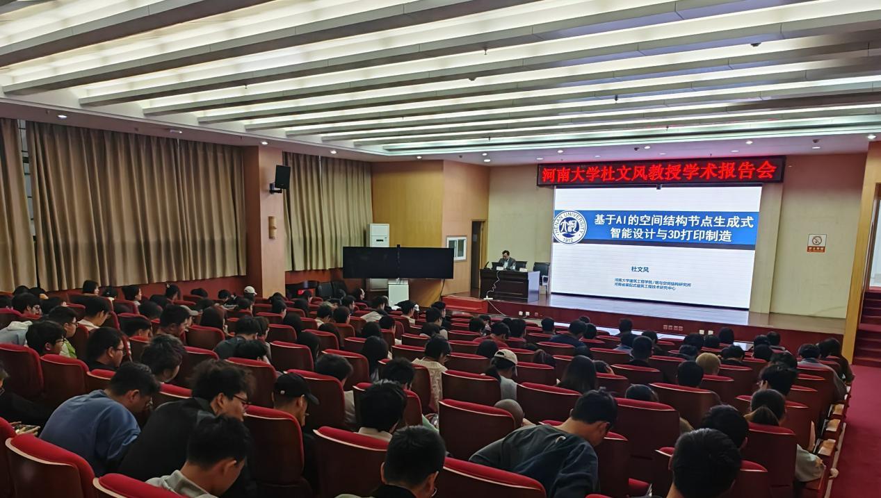 本网讯(鲁菁 张君/文 吴磊杰/图)3月24日,应土木建筑工程学院邀请,河南大学特聘教授、博士生导师杜文风在西区图书馆报告厅作了题为“基于AI的空间结构节点生成式智能设计与3D打印制造”的学术报告。本次报告会由学院院长徐俊主持,学院教职工、本科生及研究生代表参加。
