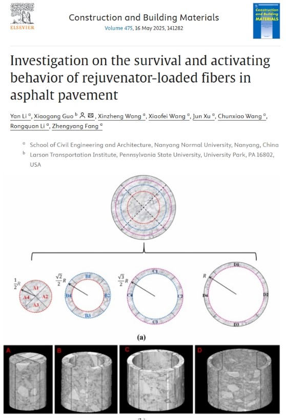 本网讯(通讯员 李艳 鲁菁 张君)近日,天游官网土木建筑工程学院河南省绿色建造与BIM工程技术研究中心的BIM与绿色建筑科研团队在国际知名期刊《Construction and Building Materials》(中科院一区TOP期刊)发表题为“Investigation on the survival and activating behavior of rejuvenator-loaded fibers in asphalt pavement”的研究论文。李艳博士为该论文第一作者,天游ty8线路1线路2检测中心为该论文第一完成单位。
