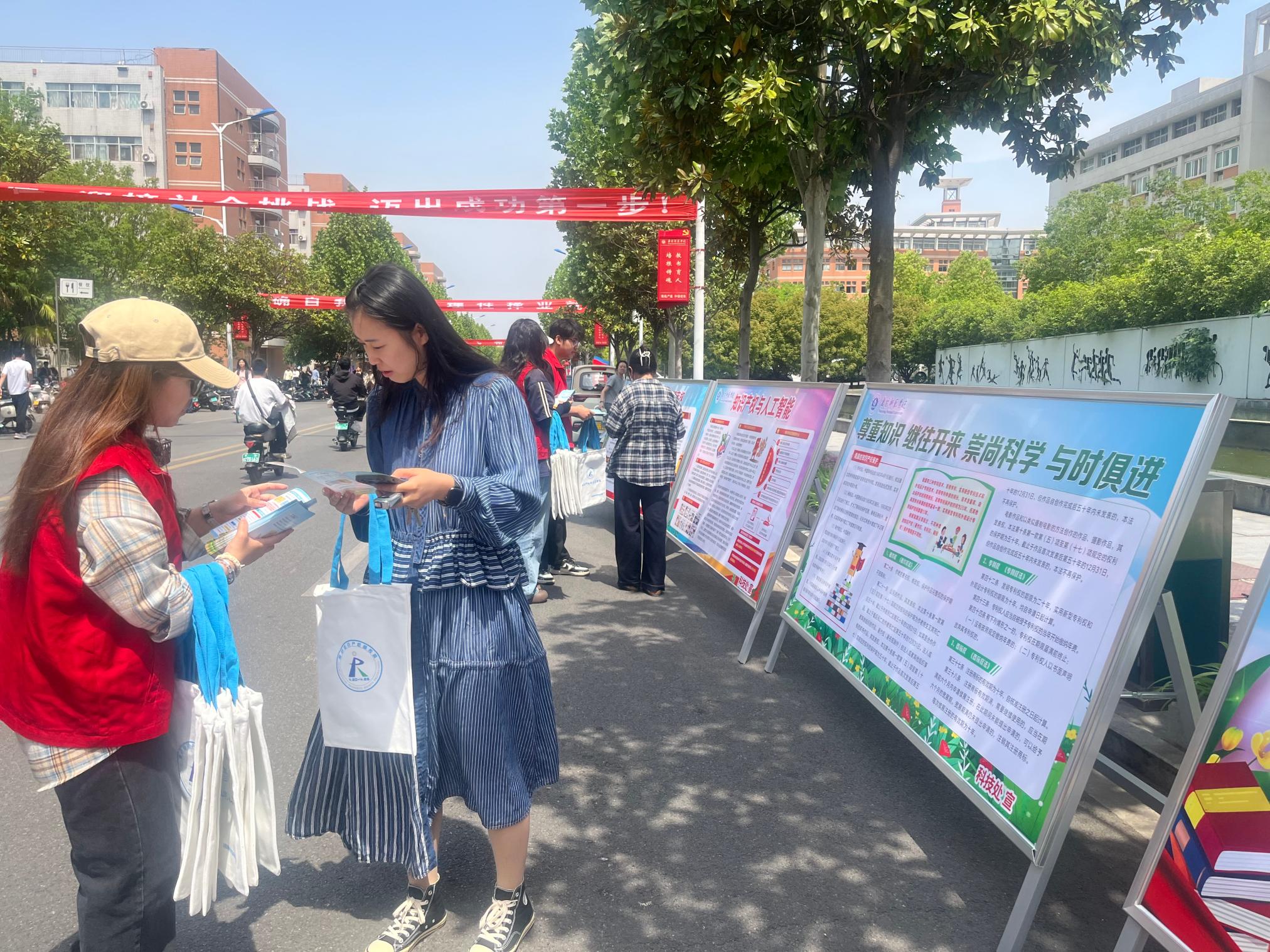 活动现场设展板,图文展示专利申报流程、著作权保护案例,吸引师生驻足学习。科技处向师生发放《中国知识产权报》《专利产权问答》等资料近300份,并派发印有宣传标语的定制布袋200余个,以实用形式传递知识产权理念。同时,知识产权专家针对师生关注的专利申请、成果转化政策、论文著作权保护等问题进行一对一解答,并通过趣味问答普及《中华人民共和国专利法》等法律知识,现场互动氛围热烈。