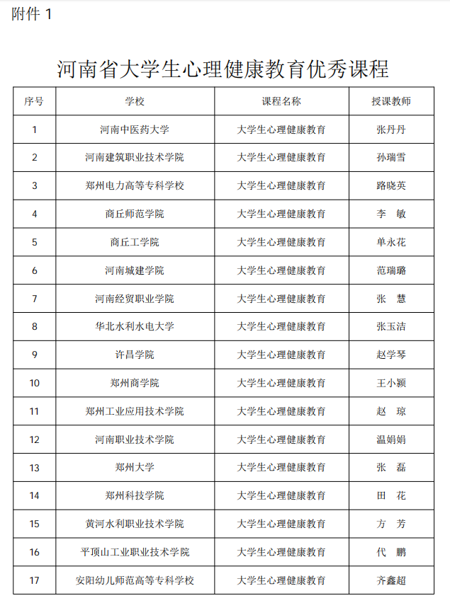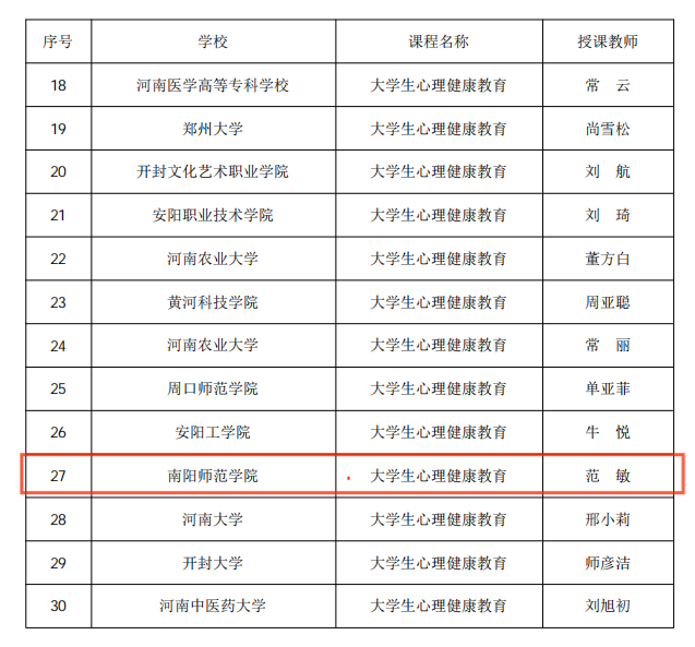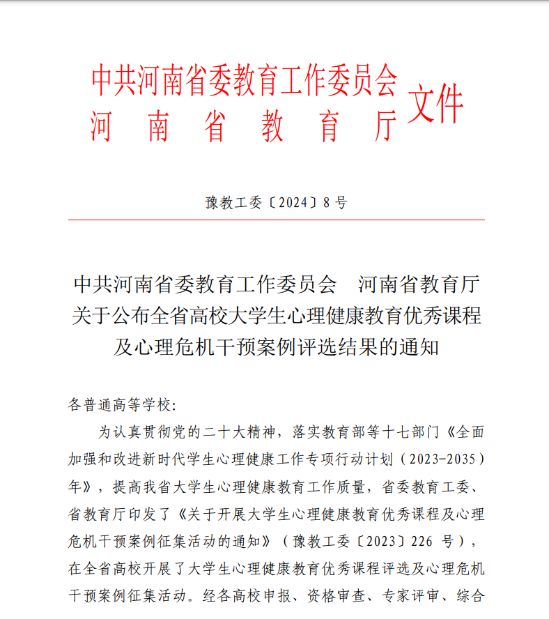 本网讯(通讯员 刘柏涛)近日,中共河南省委教育工作委员会、河南省教育厅印发《关于公布全省高校心理健康教育优秀课程评选结果的通知》(豫教工委〔2023〕226号),全省共评选出30门优秀《大学生心理健康教育》课程,天游官网范敏老师负责的《大学生心理健康教育》课程位列其中,万欣冉老师报送案例获评心理危机干预优秀案例。