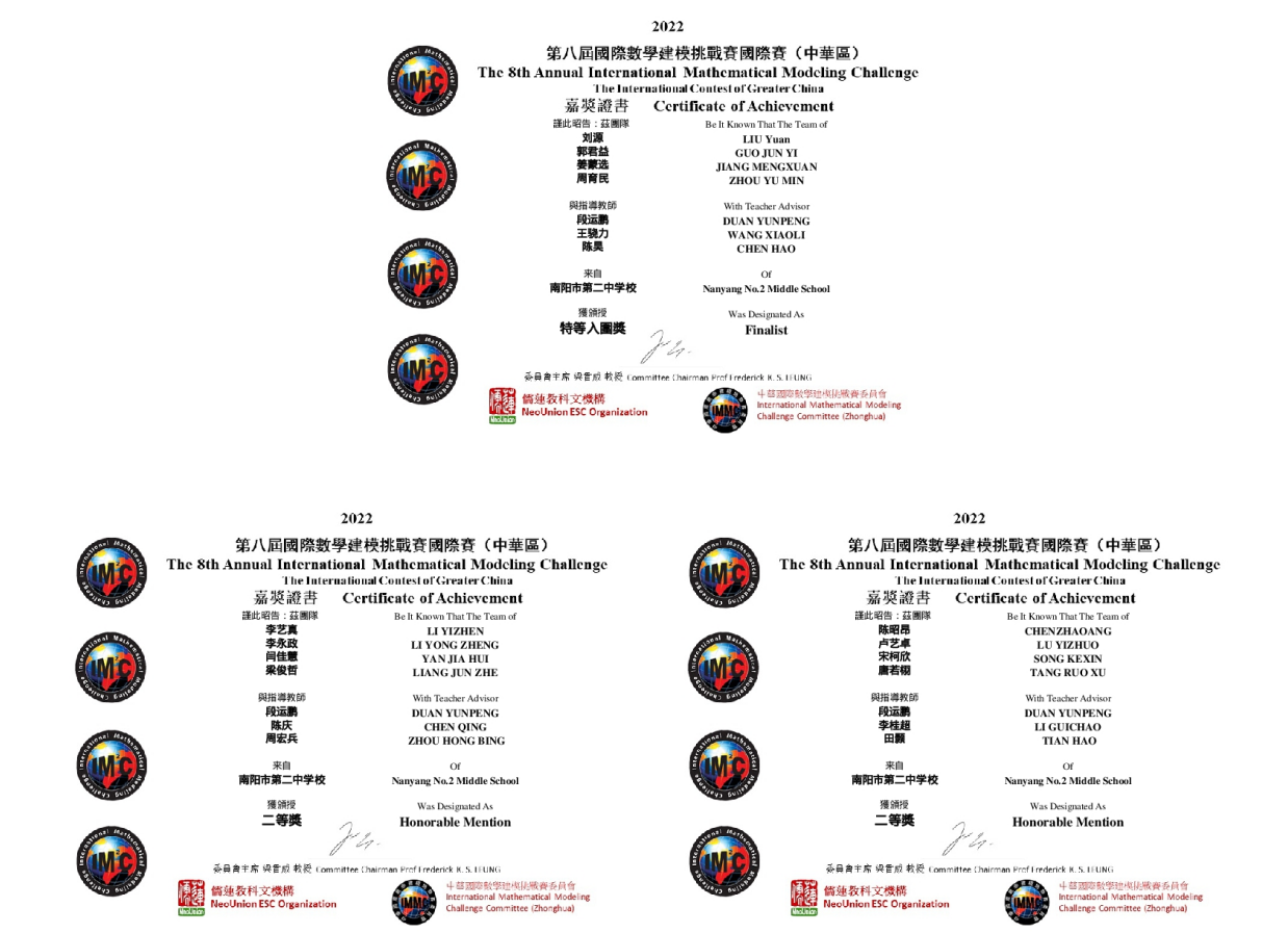 国际数学建模挑战赛(IMMC )是一项面向全球中学生的国际性新型数学建模竞赛,竞赛宗旨在于鼓励参赛者应用数学建模,探索和解决现实世界的重要问题,以普及数学建模教育,增强中学生科技创新核心素养与关键能力。本次竞赛有近800支队伍参赛,历经初赛、国际赛、答辩决赛等环节,终获佳绩。近年来,南阳市第二中学学子在该赛事上已获得国际赛特等奖入围奖(Finalist)2项,国际赛一等奖(Meritorious)2项,国际赛二等奖(Honorable Mention)4项。