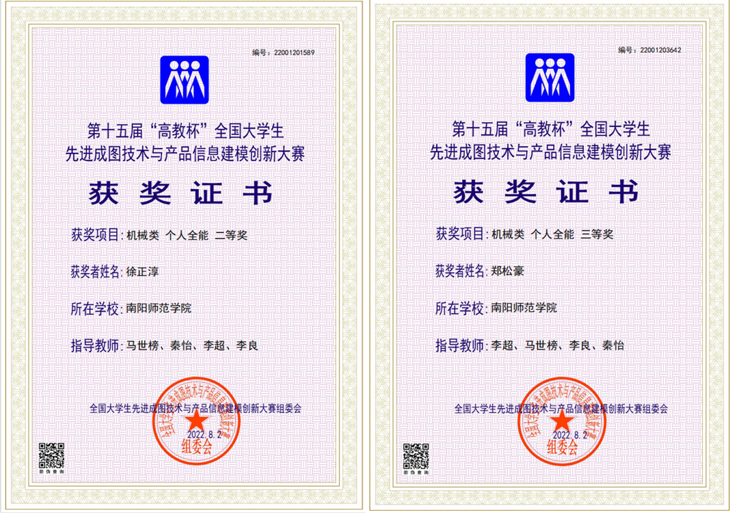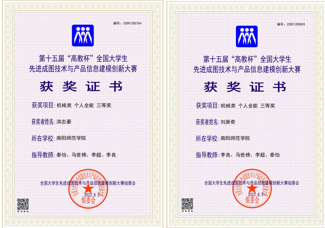 本网讯(通讯员 马世榜)近日,第十五届“高教杯”全国大学生先进成图技术与产品信息建模创新大赛全国总决赛在江苏大学落下帷幕。本届大赛采用“线上线下”相结合的方式举办,有来自全国的675所学校,1041支代表队,10349名选手参赛。天游官网机电工程学院马世榜、李超、秦怡、李良老师指导的5位学生组成的代表队参赛,取得了机械类个人全能二等奖1项、三等奖3项的好成绩。