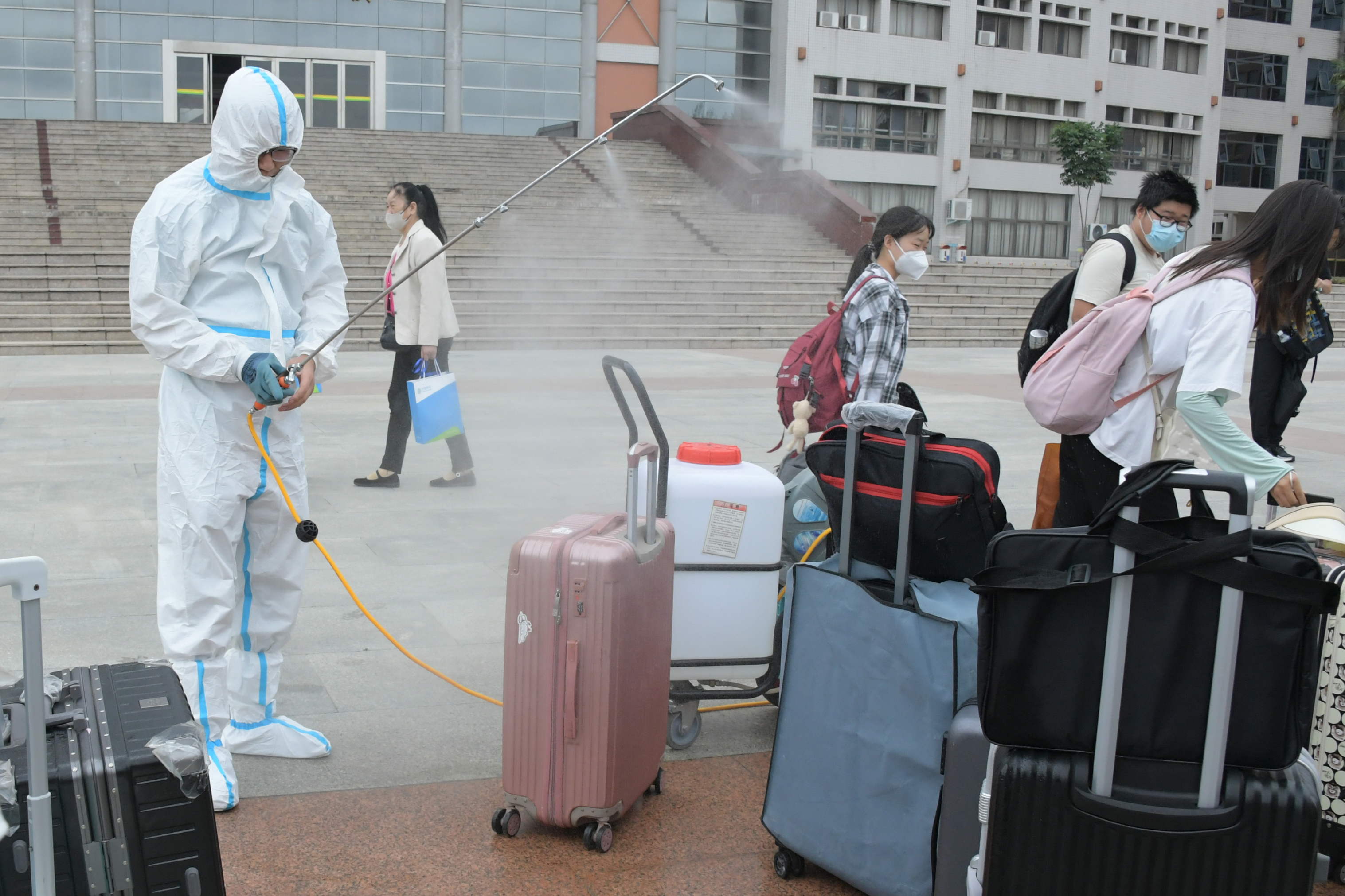 对于其他交通方式返校的学生,校门口设置专用通道。返校学生佩戴口罩、间隔排队,由校医院医务人员进行行李消毒后,配合学工队伍完成查验工作,在保卫处工作人员引导下有序入校。