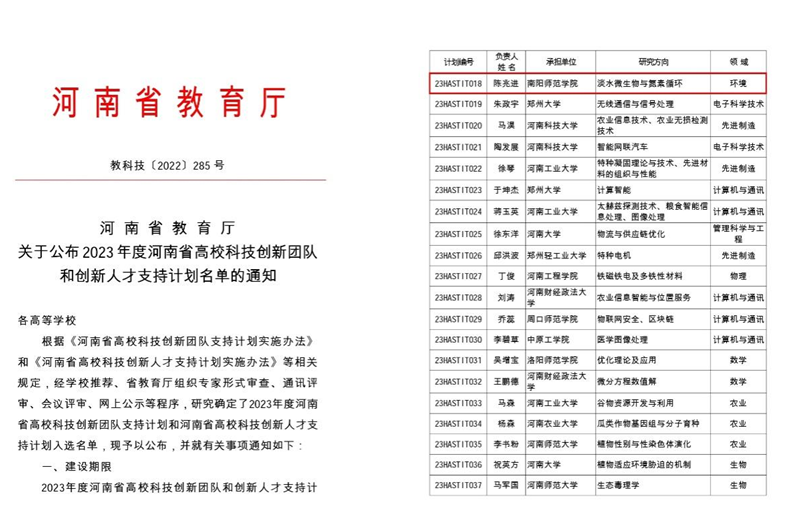 本网讯(通讯员 张新刚)近日,河南省教育厅公布了2023年度河南省高校科技创新团队和创新人才支持计划名单(教科技〔2022〕285号),天游官网水资源与环境工程学院陈兆进博士入选河南省高校科技创新人才支持计划,获得省财政经费支持30万元。
