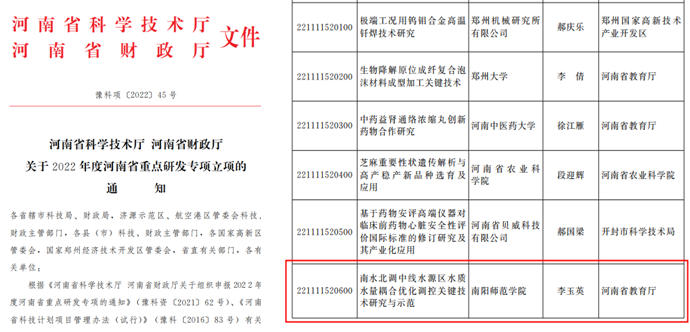 本网讯(通讯员 陈兆进)近日,河南省科学技术厅发布了2022年度河南省重点研发专项立项的通知,由南水北调学院暨水资源与环境工程学院副院长李玉英教授申报的2022年度河南省重点研发专项“南水北调中线水源区水质水量耦合优化调控关键技术研究与示范”批准立项,资助经费100万元。该项目从流域水资源演变规律与模拟技术、流域产流区水生态环境演变及保护关键技术、水源区农村农业点面源污染综合防控与生态修复关键技术与示范、水源区水质安全生态大数据信息平台构建等方面开展工作,联合清华大学、德国基尔大学、美国加州大学河滨分校、南水北调中线水源有限责任公司和河南洁达环保投资有限公司,通过国内外专家联合攻关,对水源区特殊气候带的水质水量耦合优化调控关键技术进行集成、示范和推广,探索在不牺牲生态环境的情况下南水北调中线水源区社会、生态、经济可续、协调发展的绿色生态产业,从而“守好这一库碧水”确保“一库清水永续北送”。