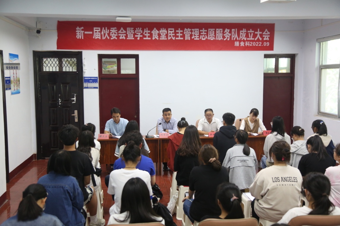 本网讯(杨永青/文 丁世豪/图)9月28日下午,后勤管理与服务中心膳食科召开新一届伙委会暨学生食堂民主管理志愿服务队成立大会。后勤管理与服务中心膳食科主要管理人员及46名学生志愿者共同参加此次会议。
