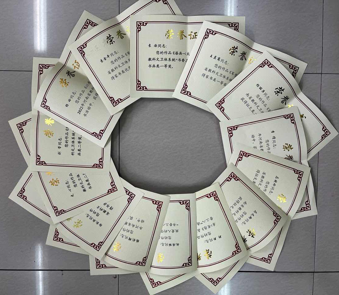 征文类别中,郑新《厨房内外的人间清欢——读<厨房>有感》获特等奖、马晓玲《南师的月牙儿》、马毛粉《最是书香慰吾心》获一等奖,滕剑锋《读<中国名茶谱>有感》、杨丽萍《家风颂-快板书》获二等奖,李倩《桃李不言下自成蹊》获优秀奖;家书类别中,赵雅丽《风雨同舟爱无悔——结婚纪念日致爱人的信》、王莫离《军营母子家书》获一等奖,杨玲《以感恩的心来理解生活》获二等奖,袁金平《寄语警察儿子》获优秀奖;书画类别中,徐凯歌《刘长卿诗一首》获特等奖,袁歆《太行》获一等奖,刘莹《春归》、史心《习主席语录》获二等奖。