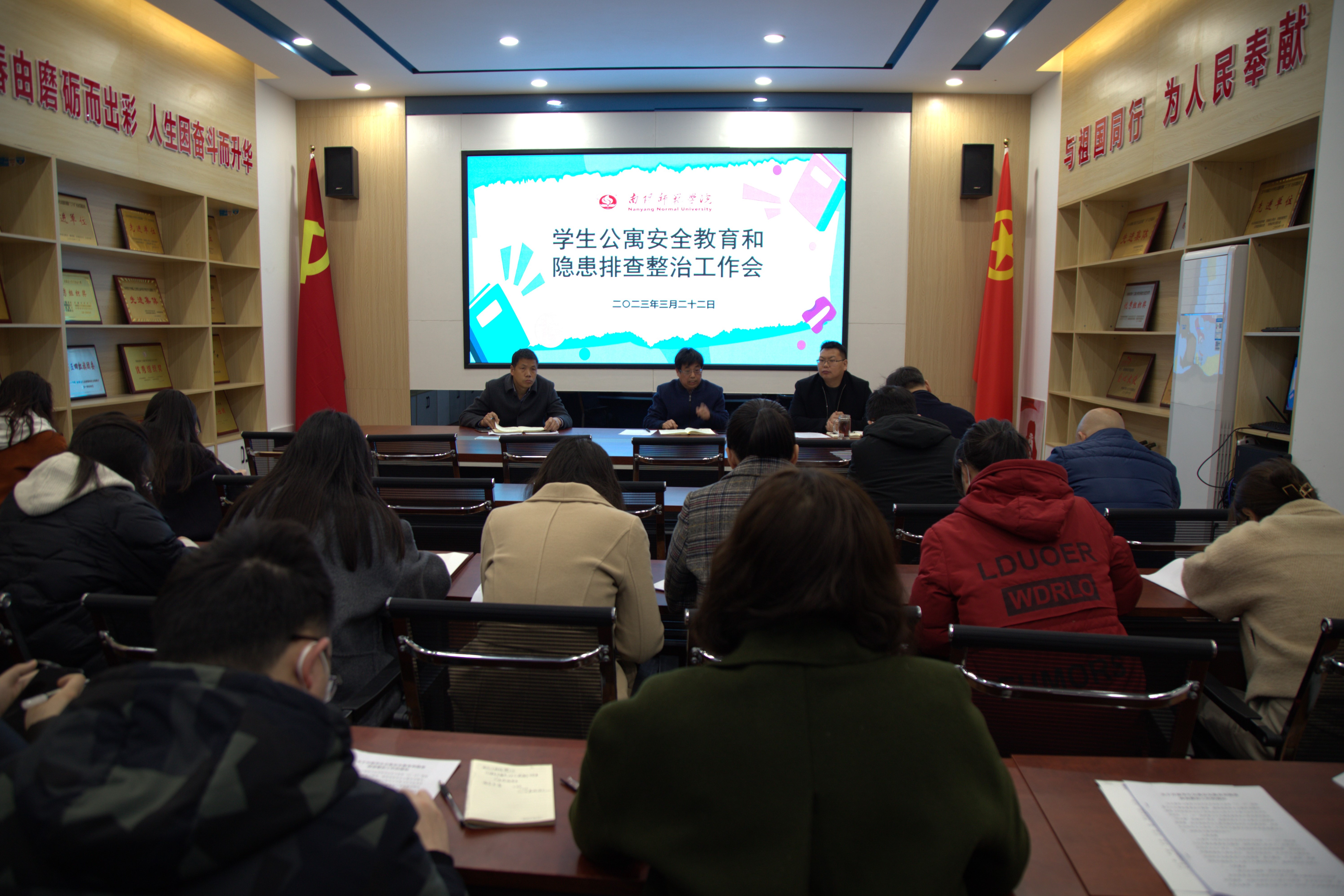 会议指出,安全稳定是学生工作的重中之重。一要提高思想认识,增强做好学生公寓消防安全工作的责任感和紧迫感。二要压实抗牢消防安全责任,推进网格化管理,加强协调联动,共同维护学生公寓安全稳定。三要健全消防安全隐患排查长效机制,并把安全隐患排查整改情况纳入年度综合治理考核。四要广泛深入开展消防安全教育,切实提高全体学生安全防范意识、火灾初期处置及自救技能。(编审 刘潇潇)