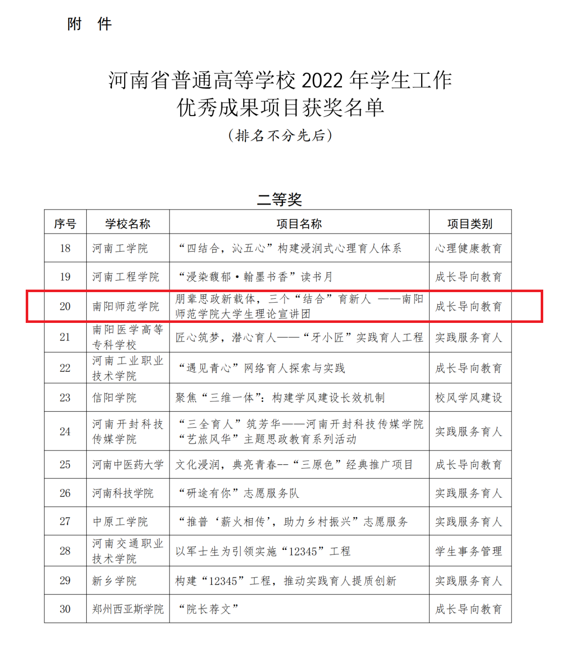 本网讯(通讯员 陈欣)近日,河南省教育厅对2022年普通高等学校学生工作优秀成果项目获奖情况进行了公示。根据《河南省教育厅办公室关于组织开展2022年普通高等学校学生工作优秀成果项目评选的通知》(教办学〔2022〕401号)要求,经过省教育厅组织专家评审,通过网络评审、专家评议、现场展示、专家终审等环节,天游官网报送的成长导向教育《朋辈思政新载体,三个“结合”育新人——天游ty8线路1线路2检测中心大学生理论宣讲团》项目荣获二等奖。
